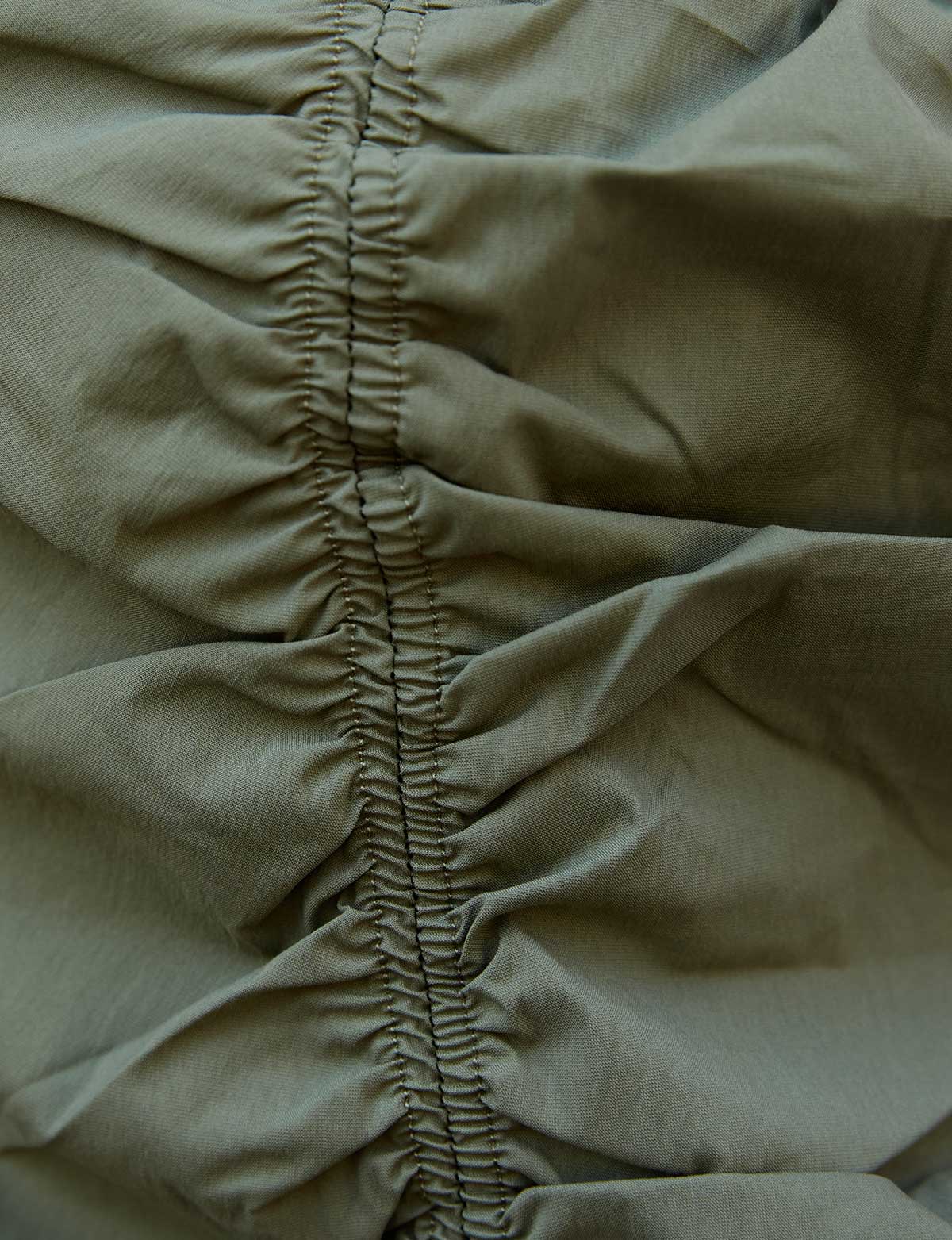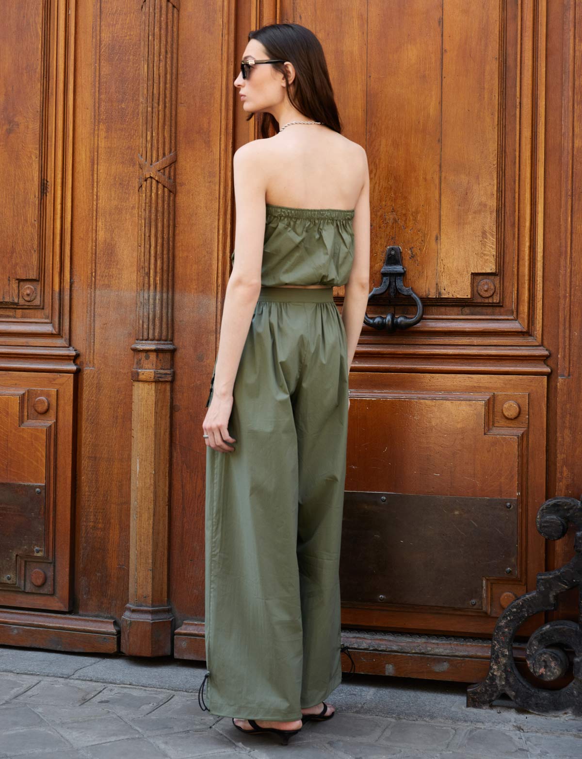 Olive strapless ruched crop top with drawstring neckline. Styled with matching cargo pants .100% rayon