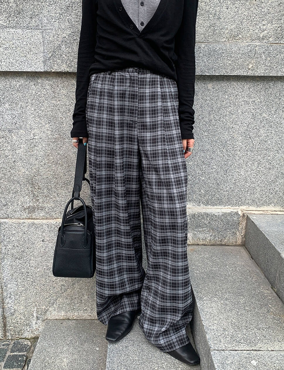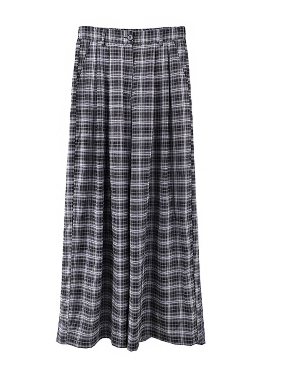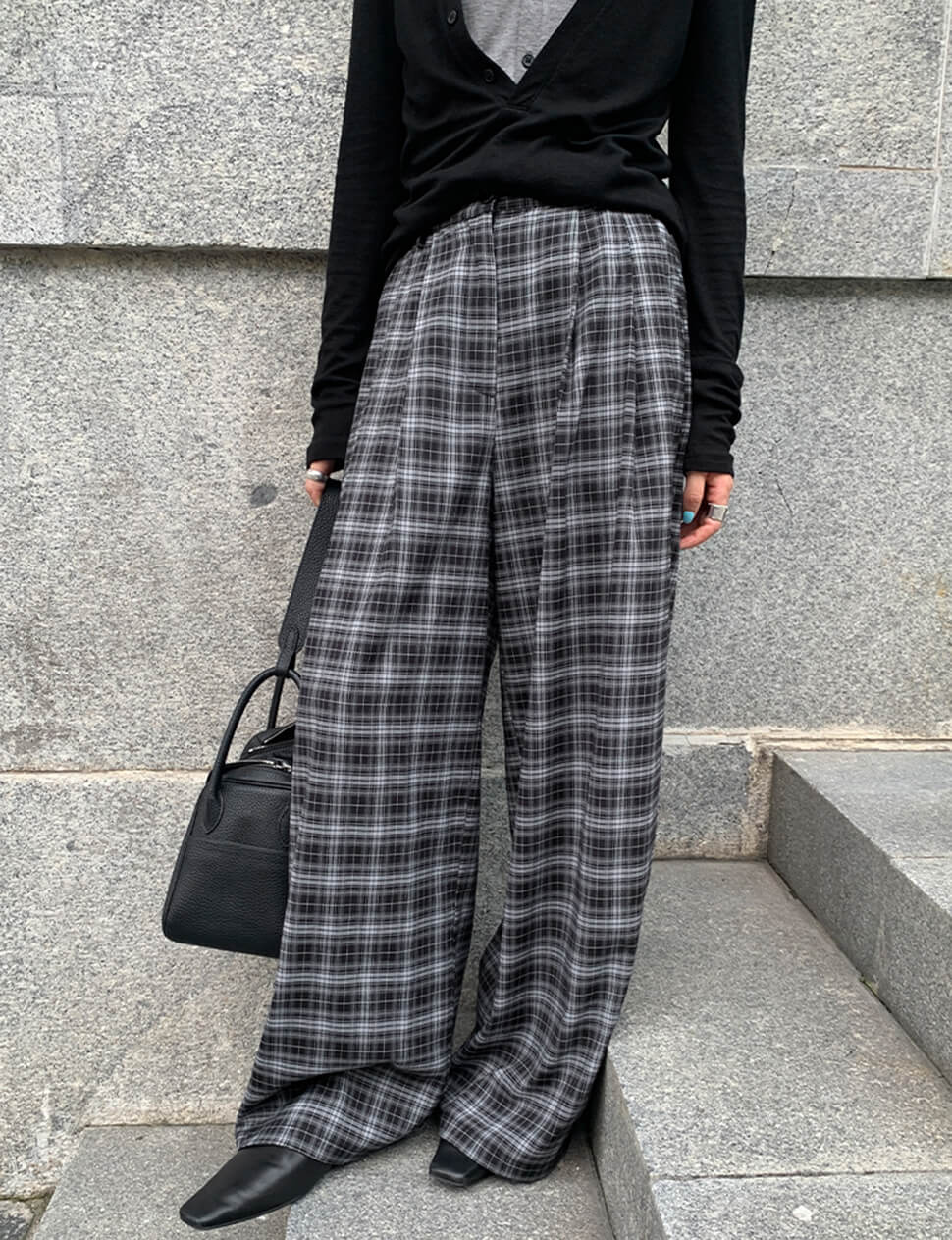 The pants that make getting dressed feel effortless. Cut in a relaxed wide-leg silhouette with a high waist and soft pleats, these grey and black plaid trousers strike the perfect balance between tailored and laid-back. Made from a lightweight fabric, they drape beautifully and feel even better. Style them with a fitted black top and square-toe boots