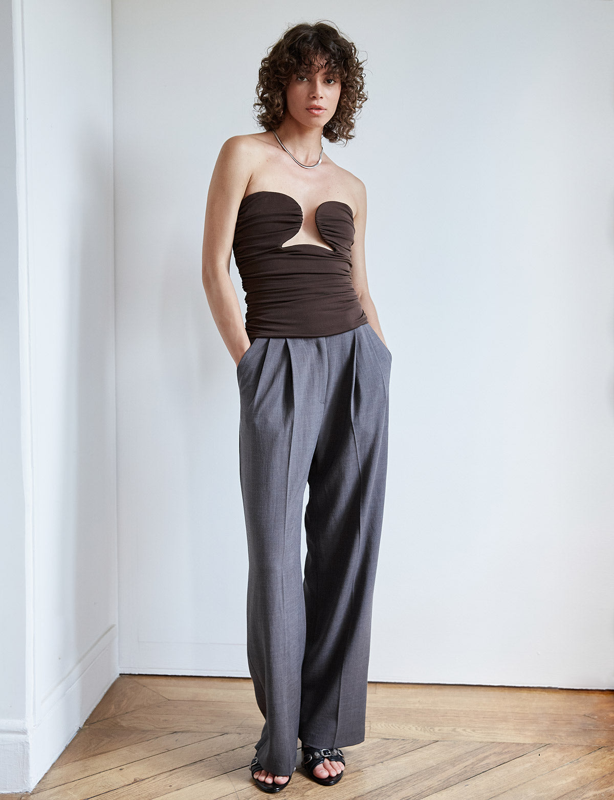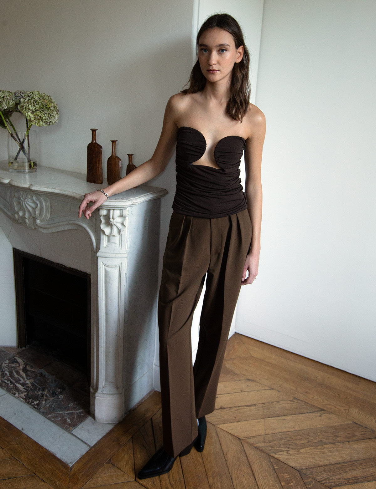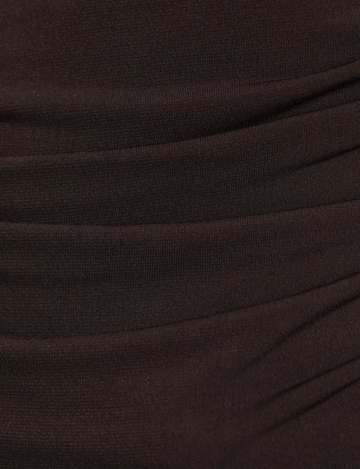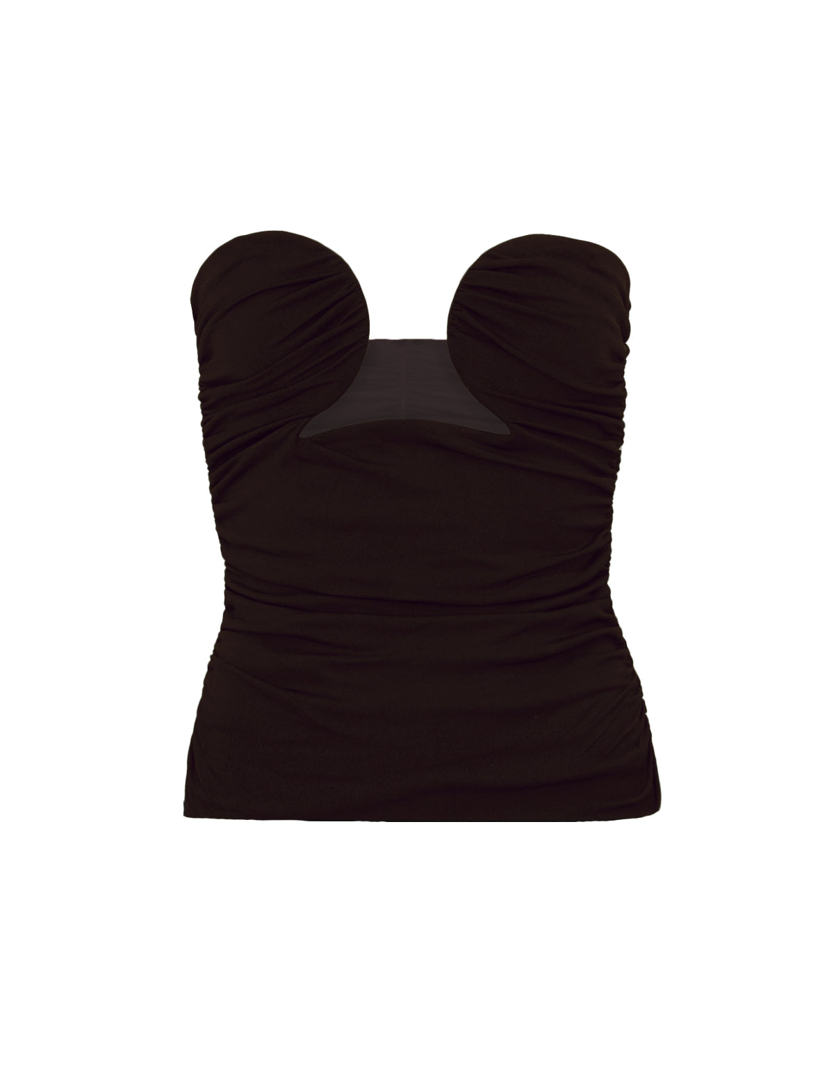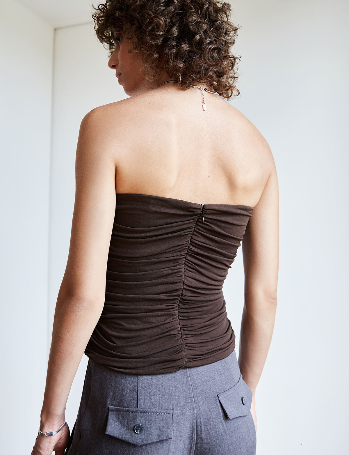 Dark chocolate brown open sweetheart neckline top with ruched bodice.
