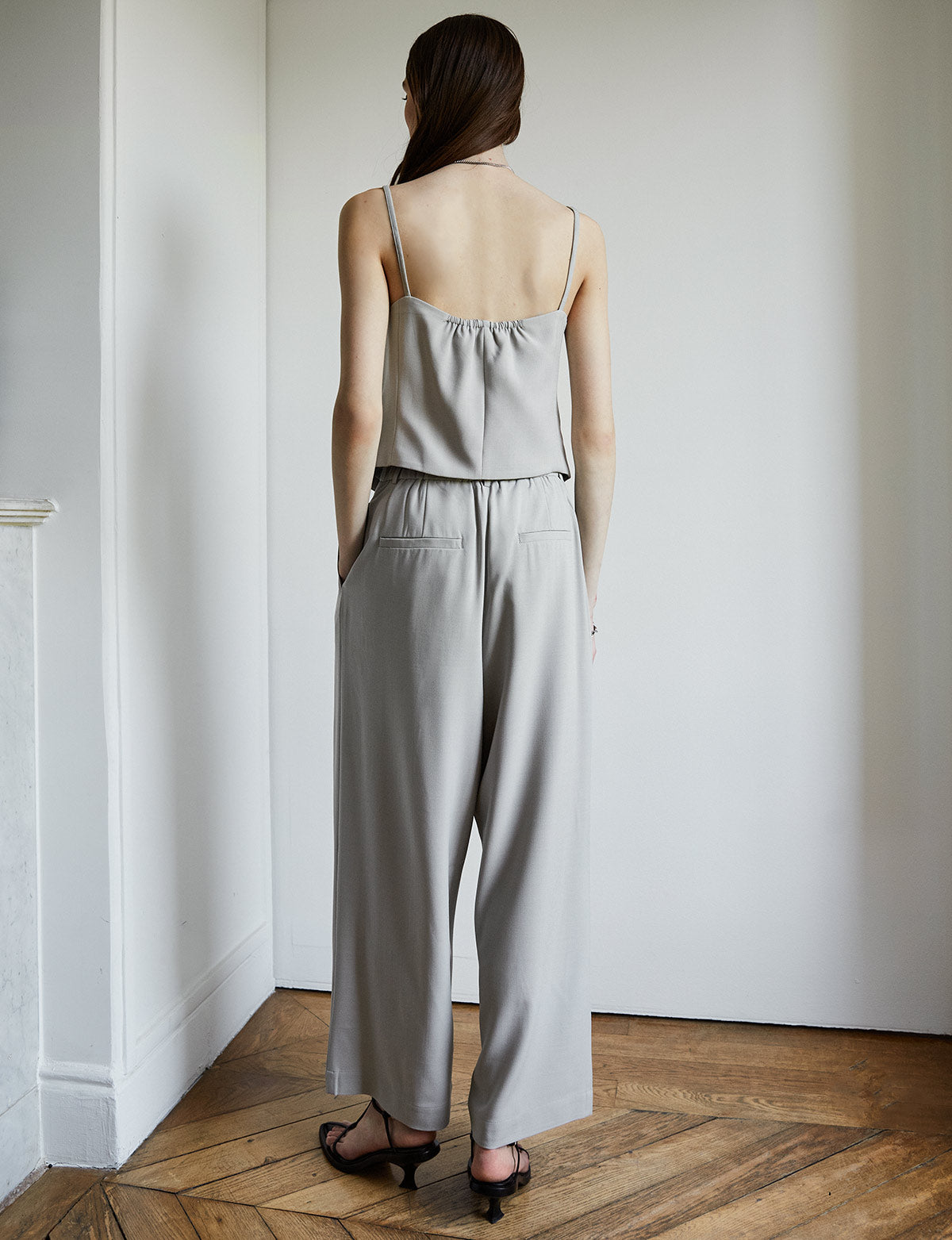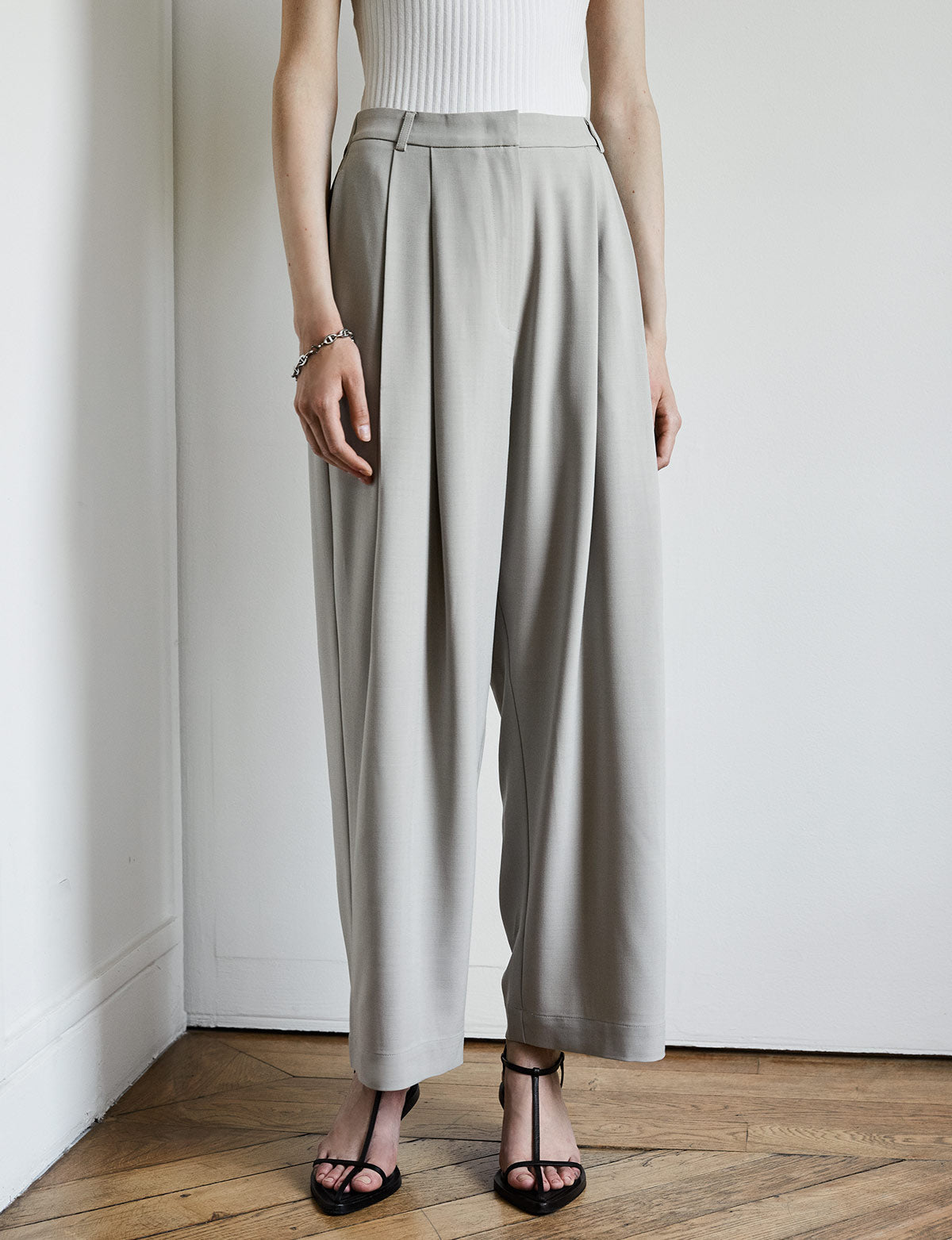 Relaxed soft grey tailored pleated pants . Styled with matching vest .