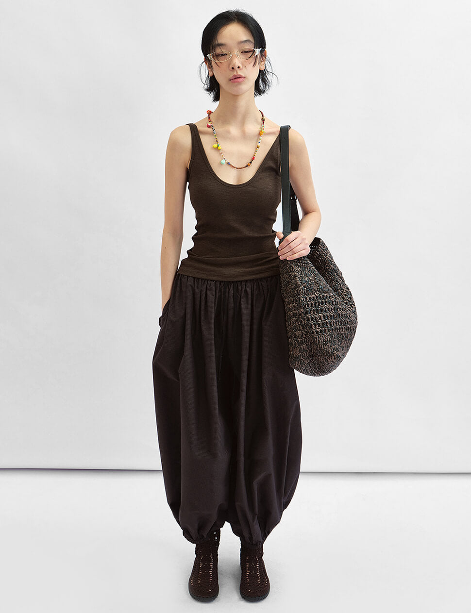 A statement silhouette that wears like a second skin. These wide-leg balloon pants are cut from a lightweight cotton-blend in a subtle micro-check print — the kind of texture that reads as almost solid from a distance, but adds depth up close. The elasticated drawstring waist gathers into a dramatically voluminous body that tapers and cinches at the ankle, creating that sculptural, effortless shape that's all over the best-dressed feeds right now. Features side pockets and a tapered gathered ankle cuff. I