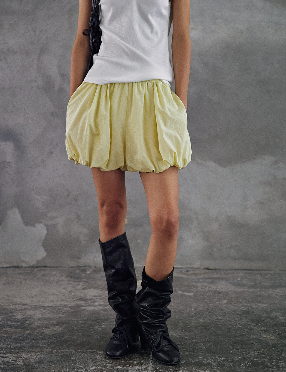 The Puff Short earns its name. Cut from 100% cotton with a gathered bubble hem that rounds softly at the thigh, it has the kind of shape that looks intentional from every angle. The elastic waist sits naturally at the hip, the volume is generous without being excessive, and the cotton moves with enough lightness that wearing them feels effortless rather than costumed. Wear them with the Atelier Jacket as a set, or with a fitted tank and boots for a contrast that works harder than it looks. Available in black, white and yellow.
