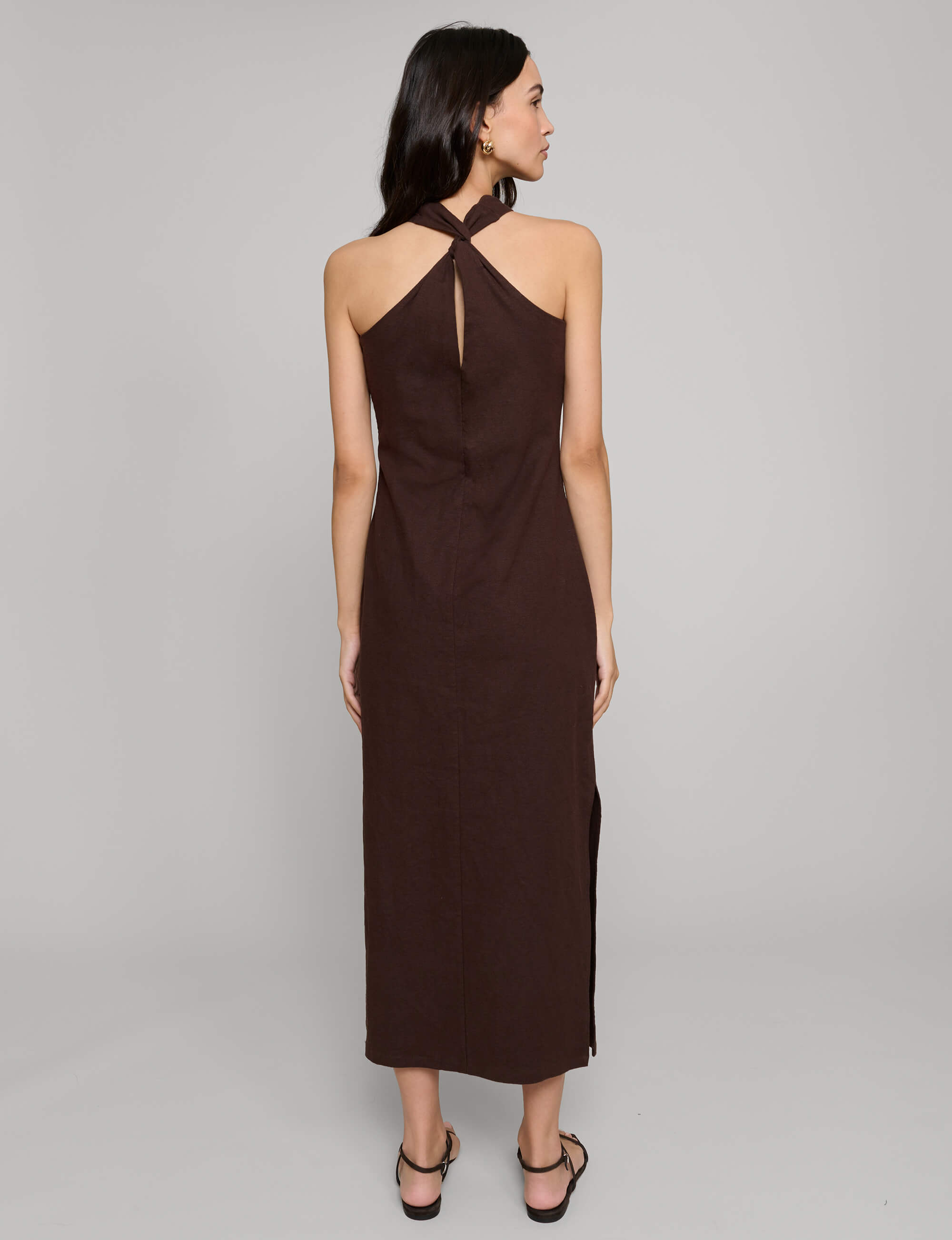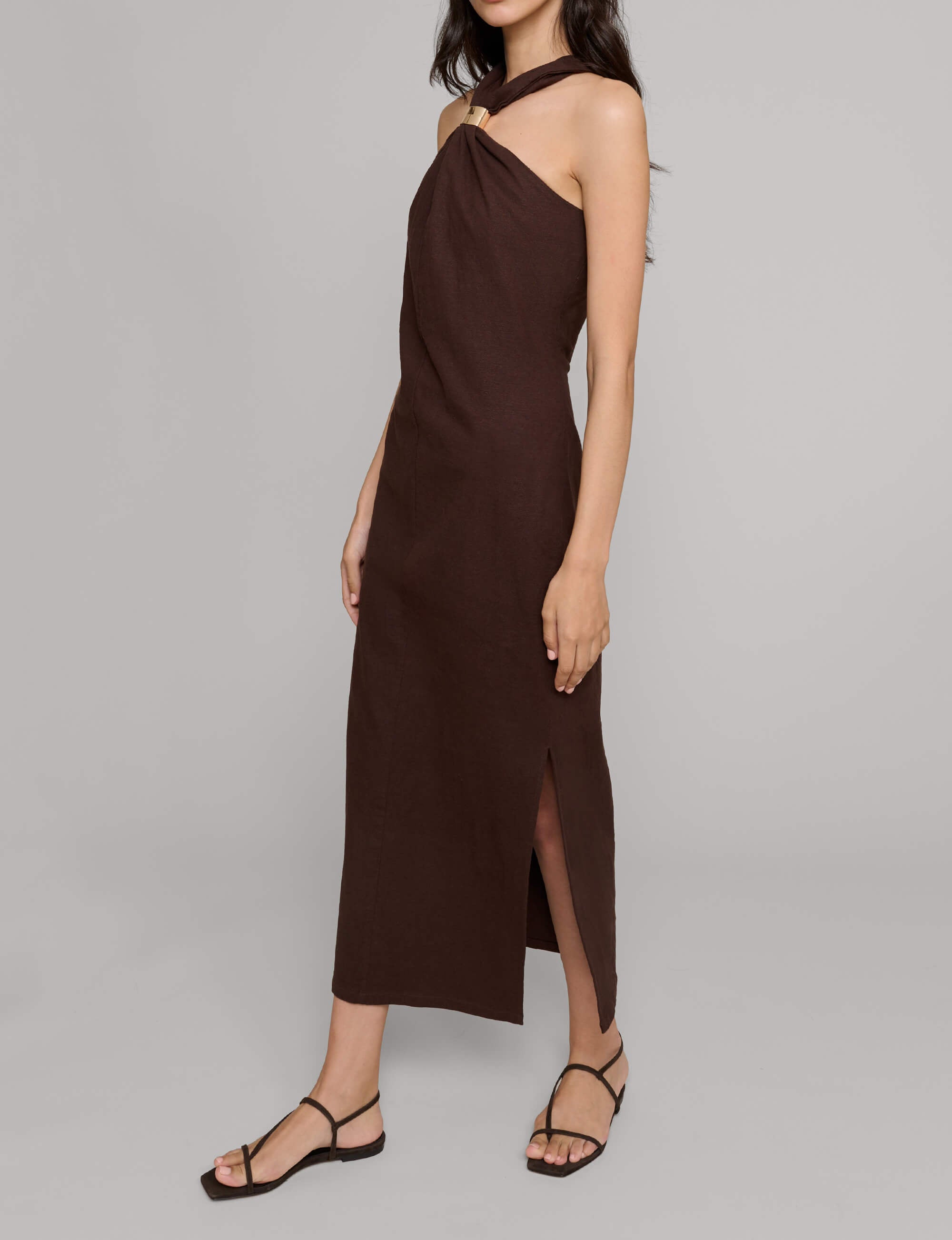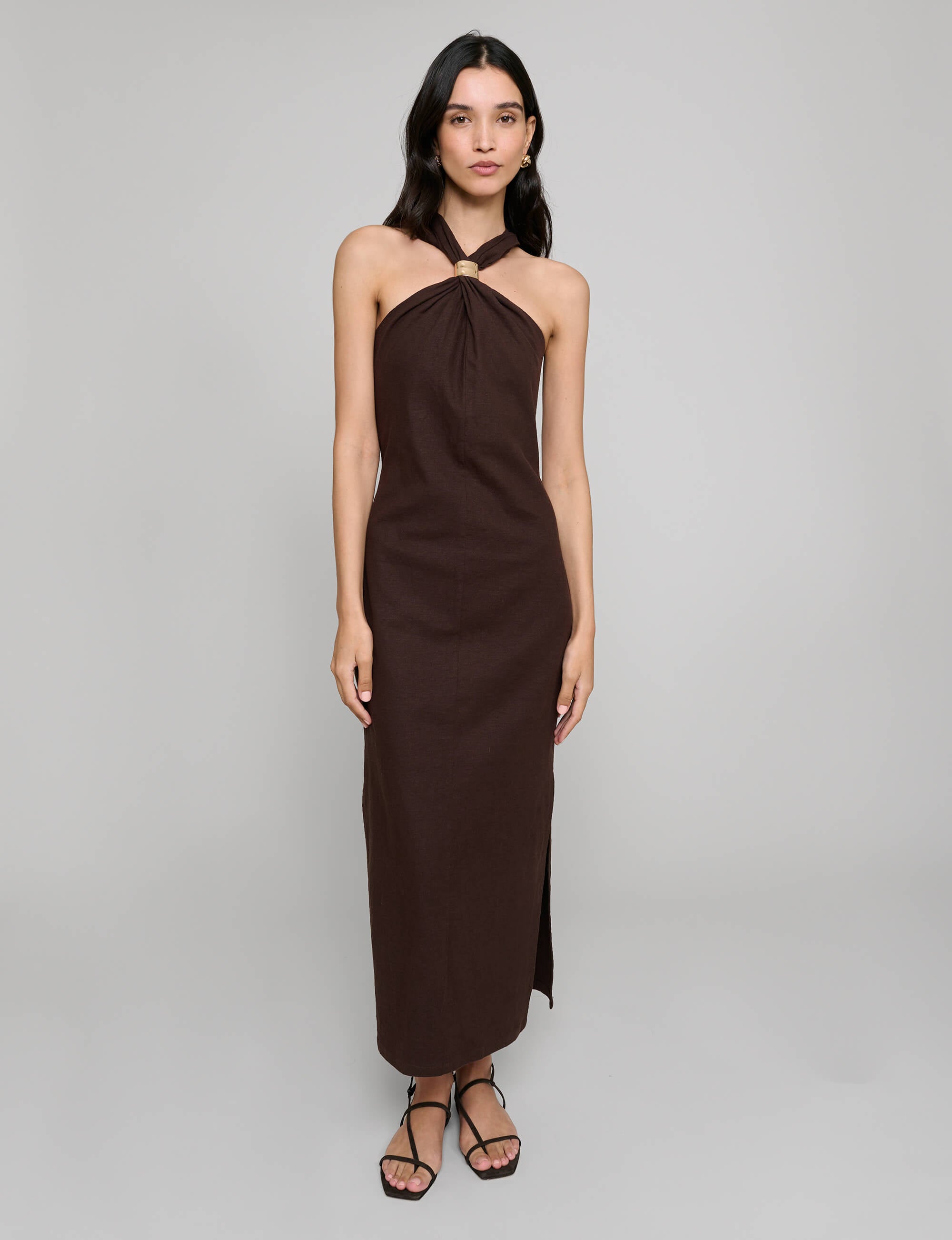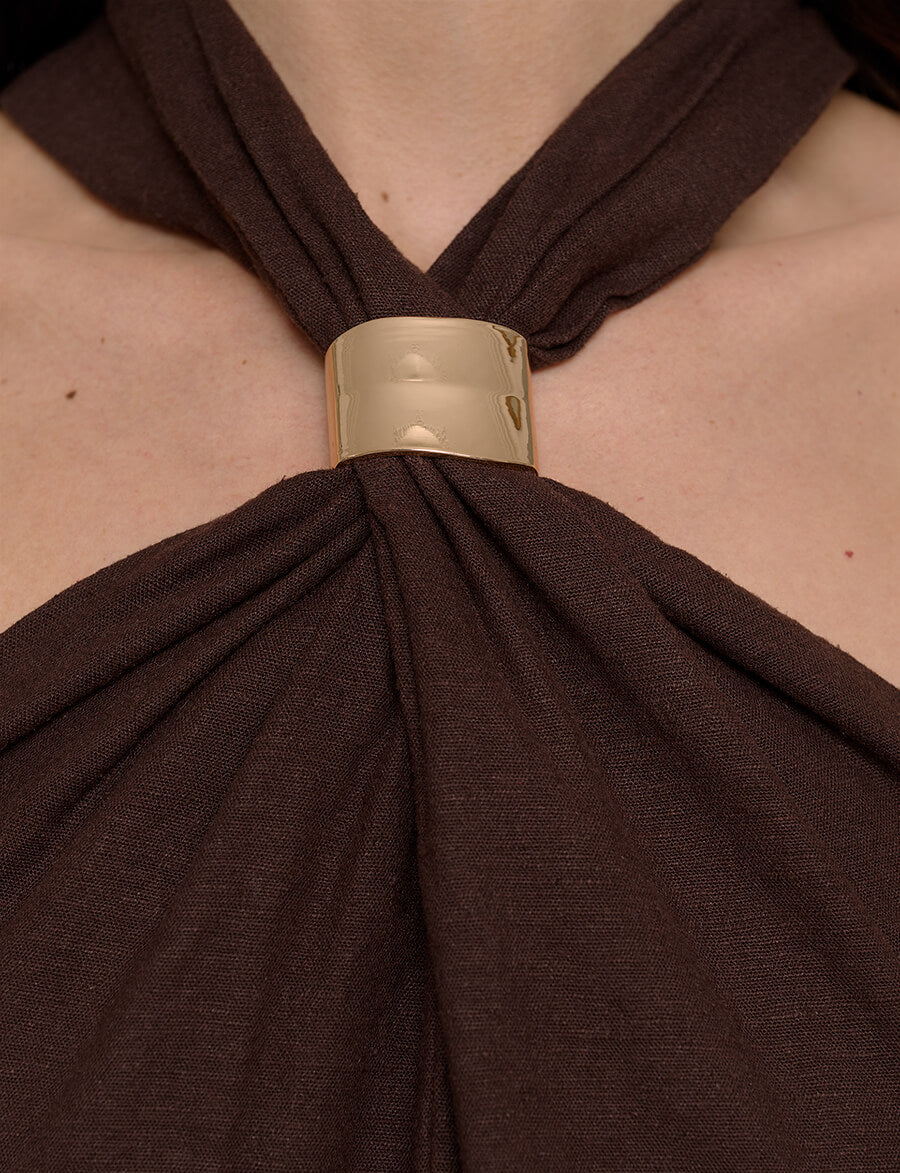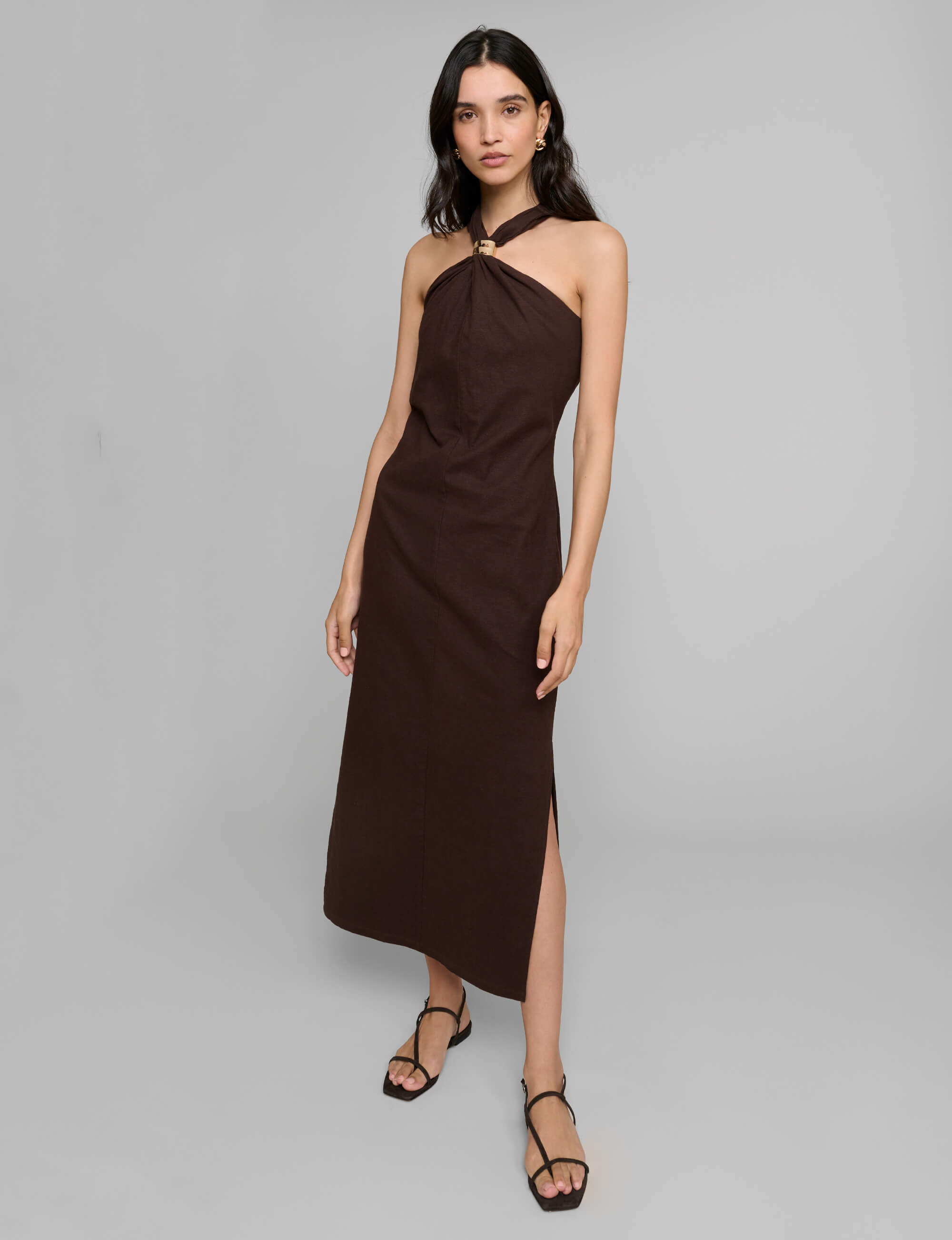 Chic and Holiday-perfect brown linen-stretch midi dress with gold cuff halter neckline.
