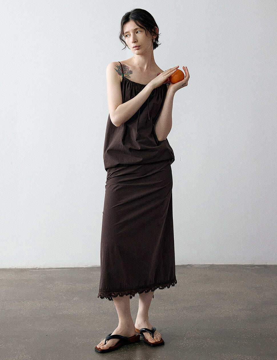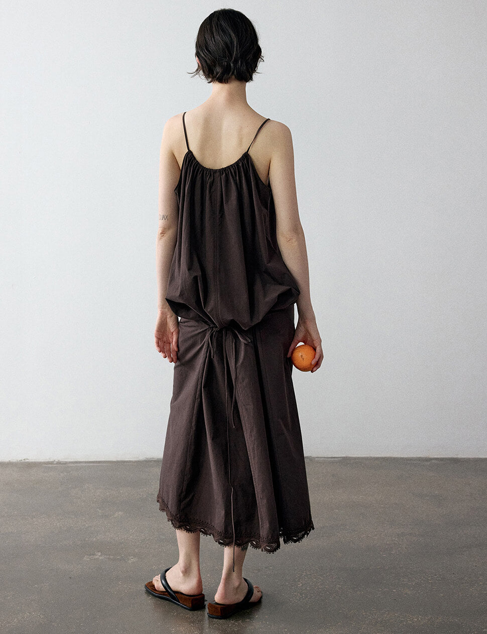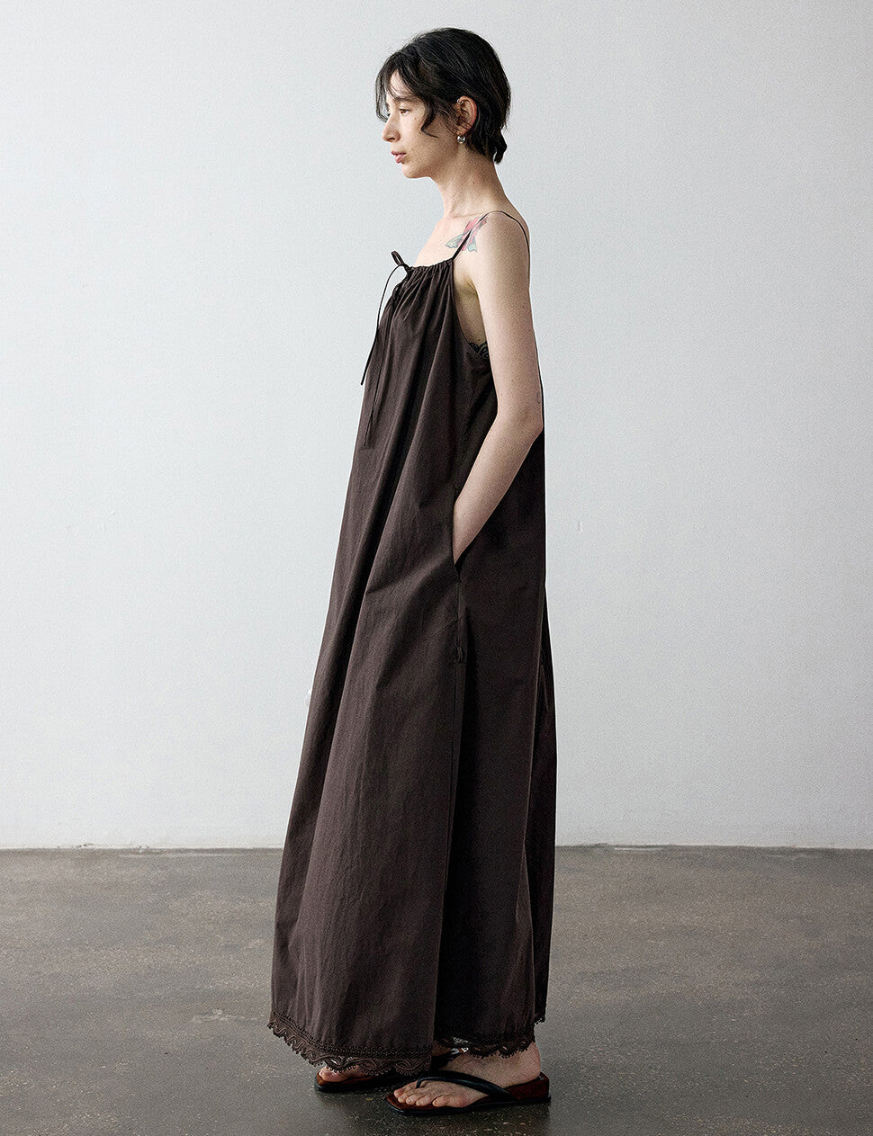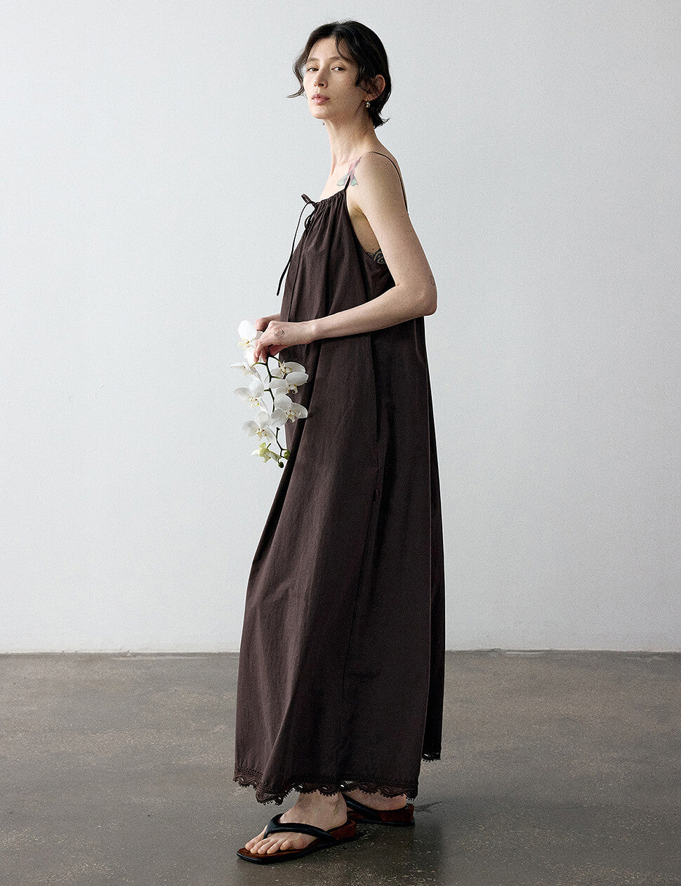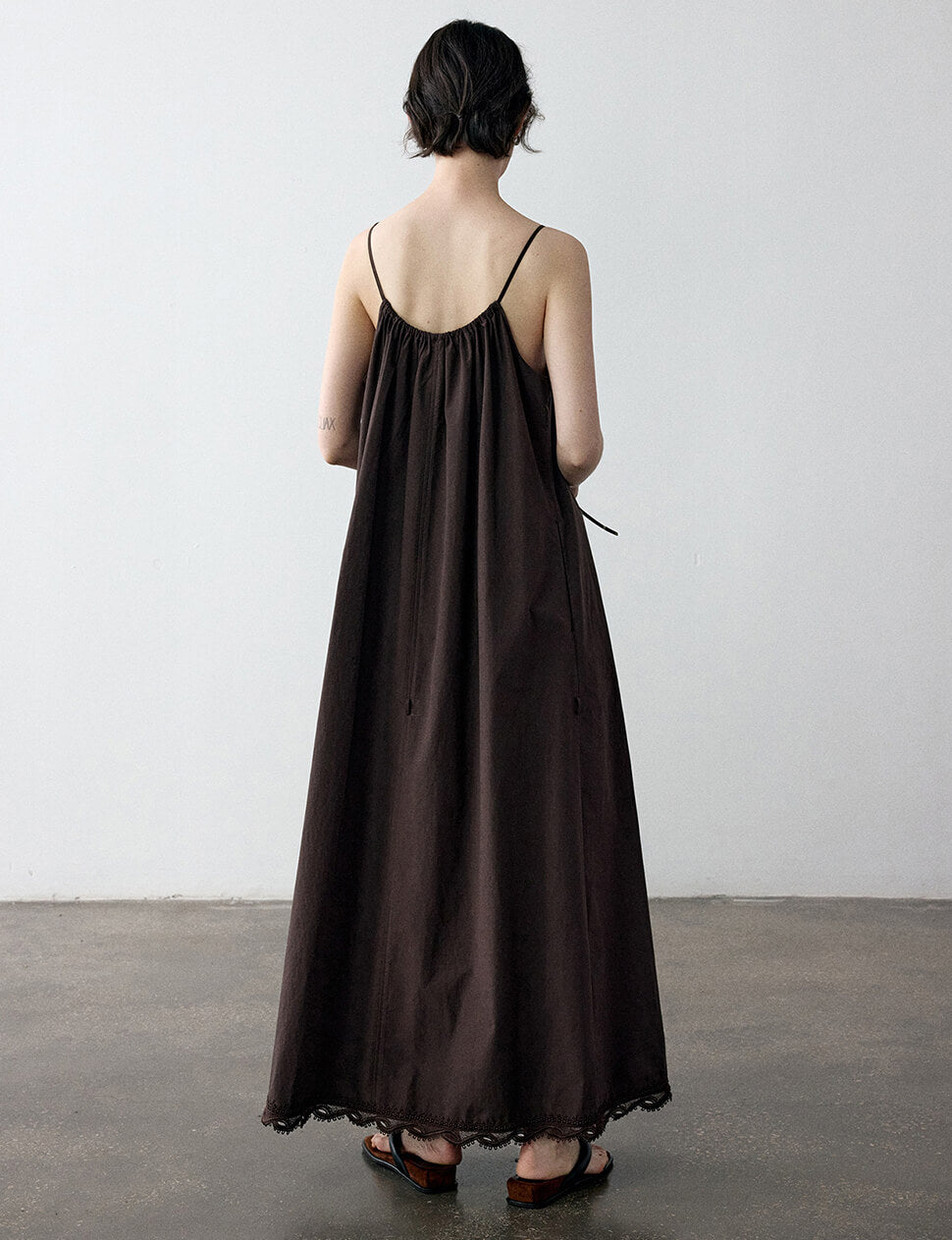 FINAL SALE Chocolate brown cotton maxi dress with lace hem trim