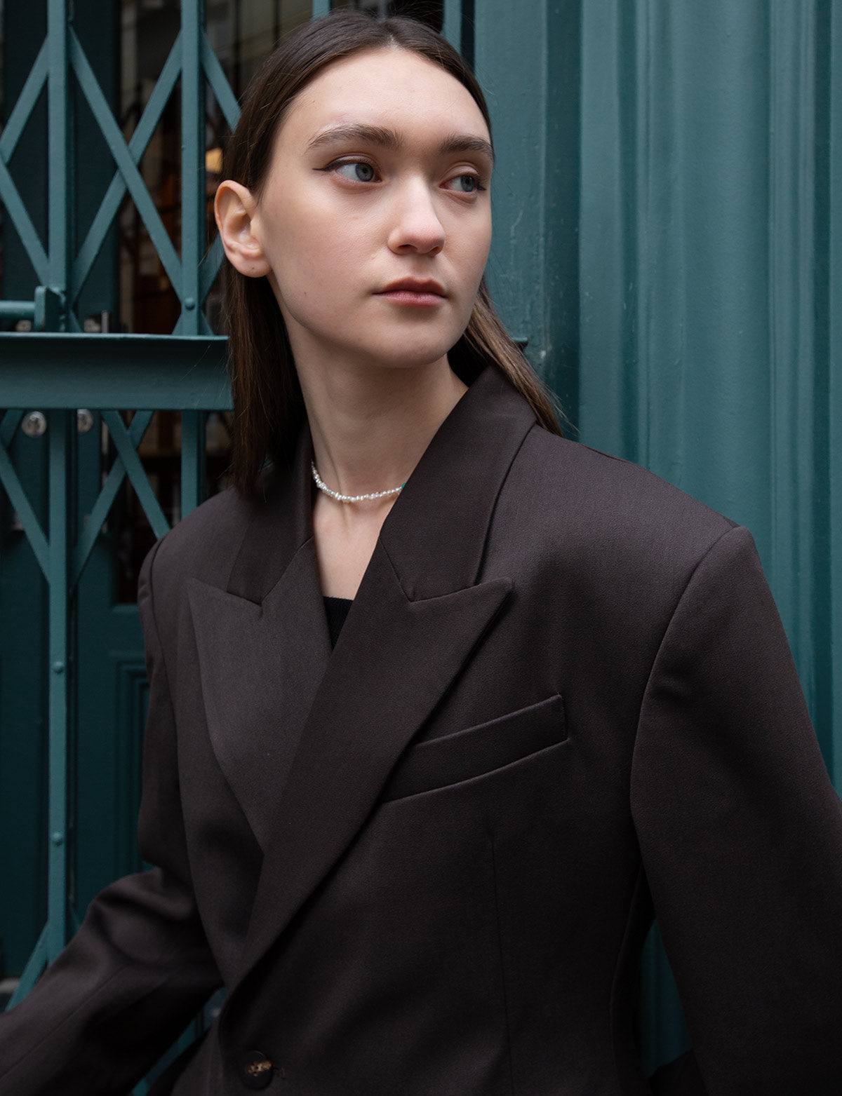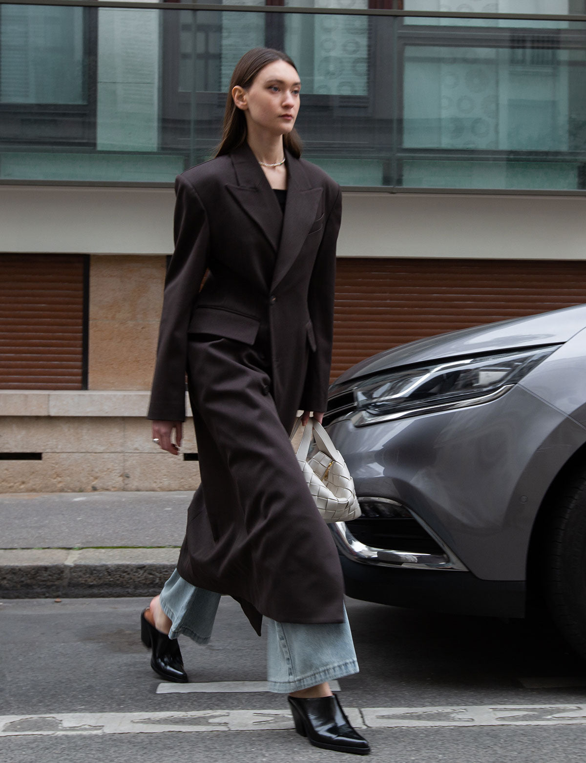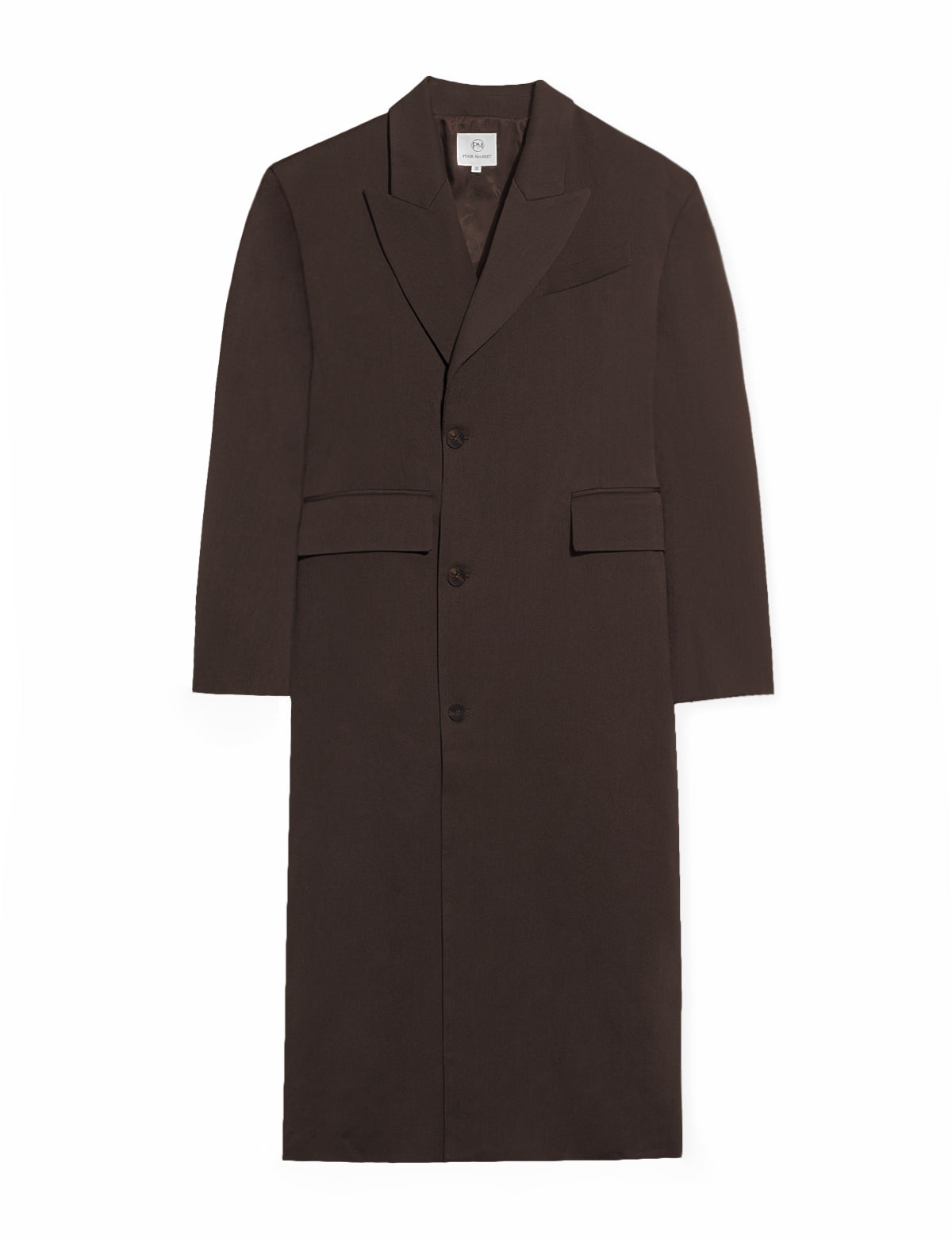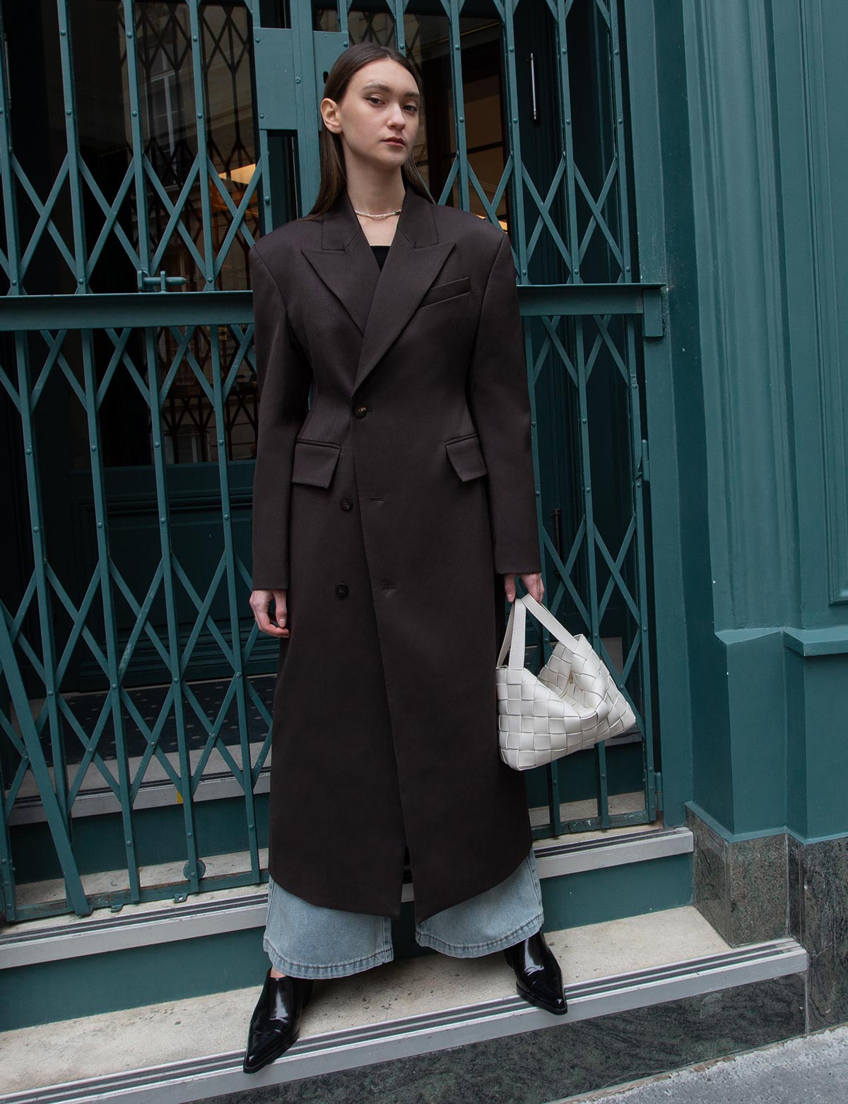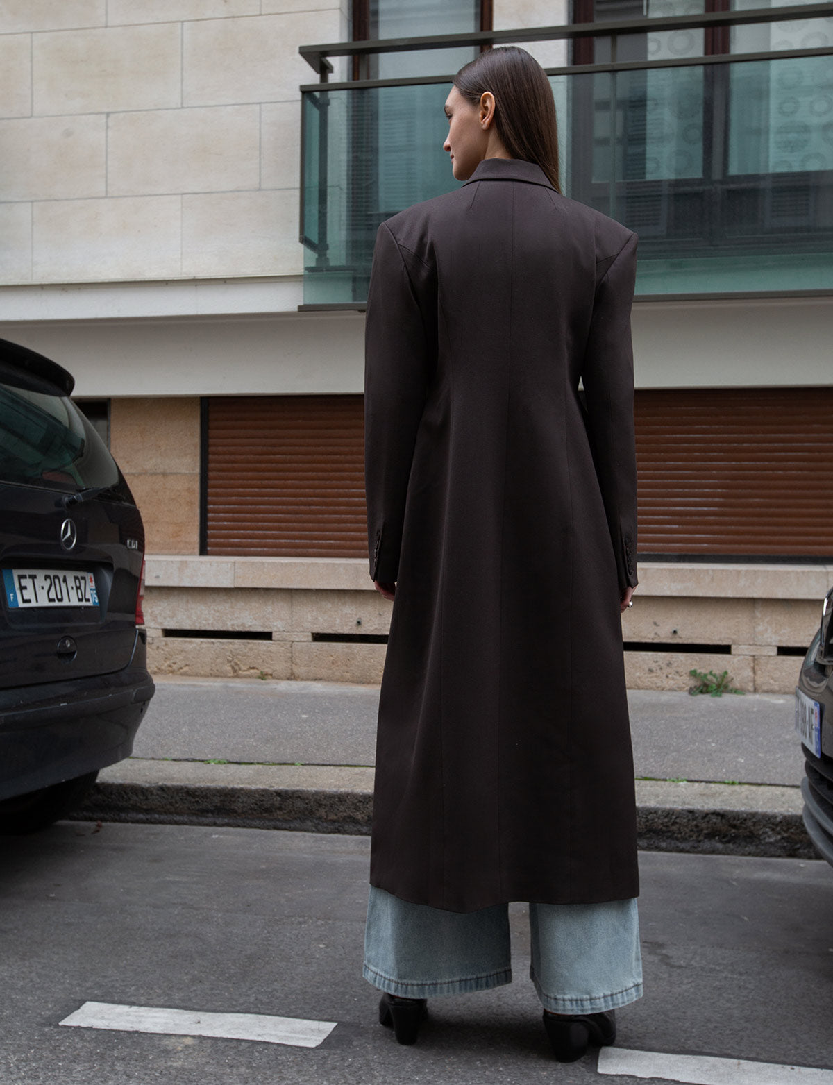 Chic dark brown hourglass cut floor length blazer coat with dropped padded shoulders