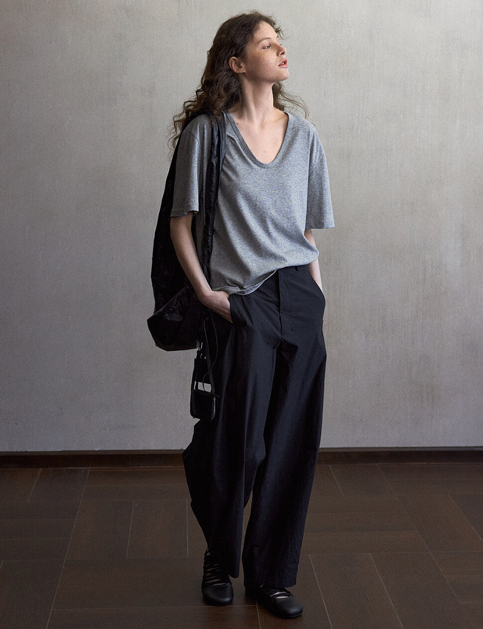 We produce on demand-once it's gone, it's gone.The t-shirt you've been looking for. Cut in a relaxed fit with a soft scoop neckline, this is the kind of piece that looks effortless with everything — wide-leg pants, a slouchy denim, a skirt. The fabric blend of lyocell, cotton and hemp gives it a lived-in drape that gets better every time you wear it, without ever looking sloppy. The slightly curved hem sits just right whether you tuck it, half-tuck it, or leave it alone.