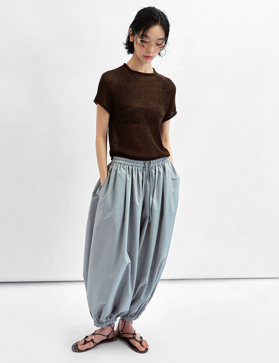 We produce on demand-once it's gone, it's gone.A statement silhouette that wears like a second skin. These wide-leg balloon pants are cut from a lightweight cotton-blend in a subtle micro-check print — the kind of texture that reads as almost solid from a distance, but adds depth up close. The elasticated drawstring waist gathers into a dramatically voluminous body that tapers and cinches at the ankle, creating that sculptural, effortless shape that's all over the best-dressed feeds right now. Features side pockets and a tapered gathered ankle cuff. I