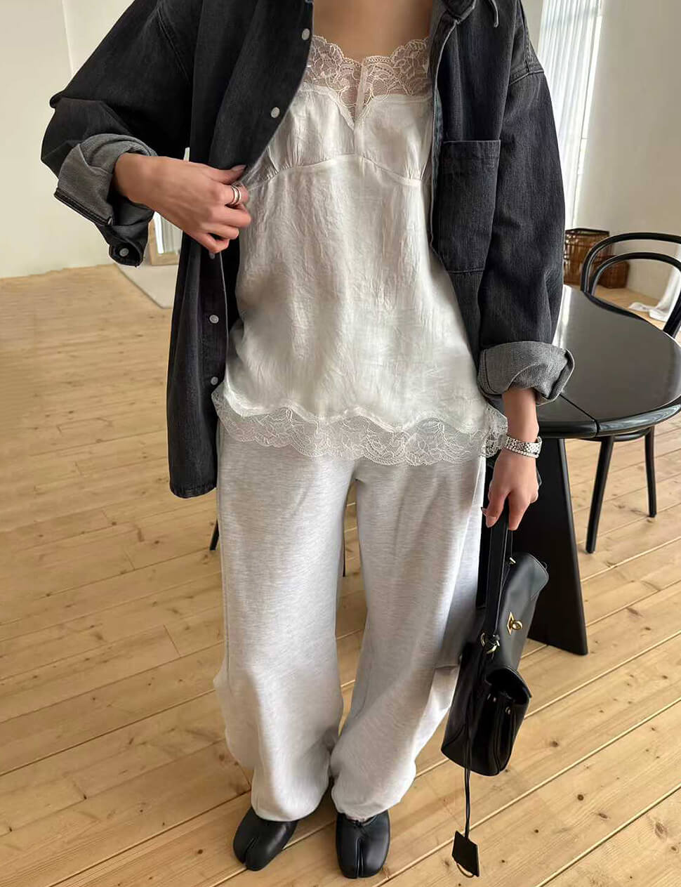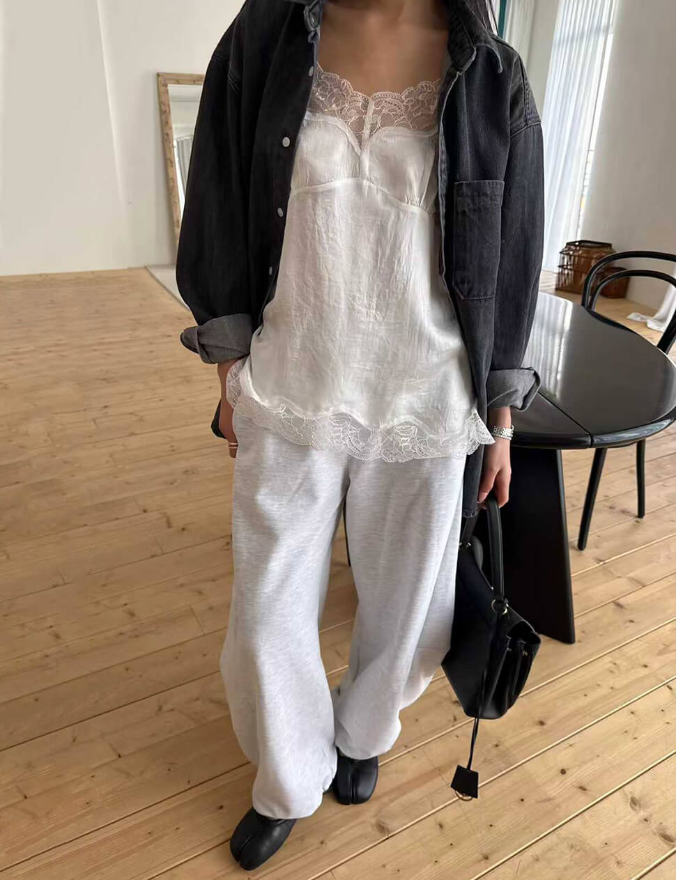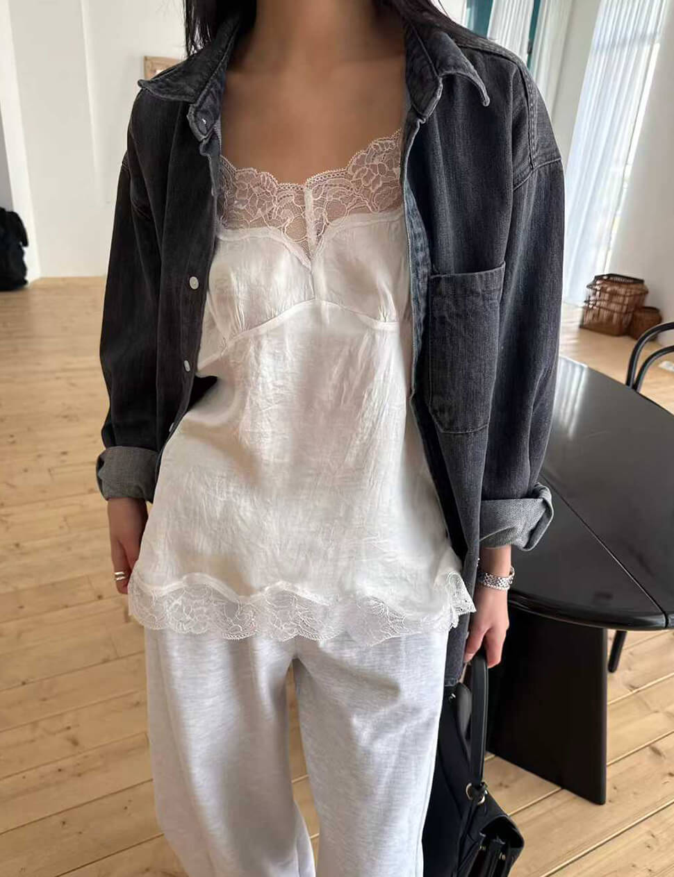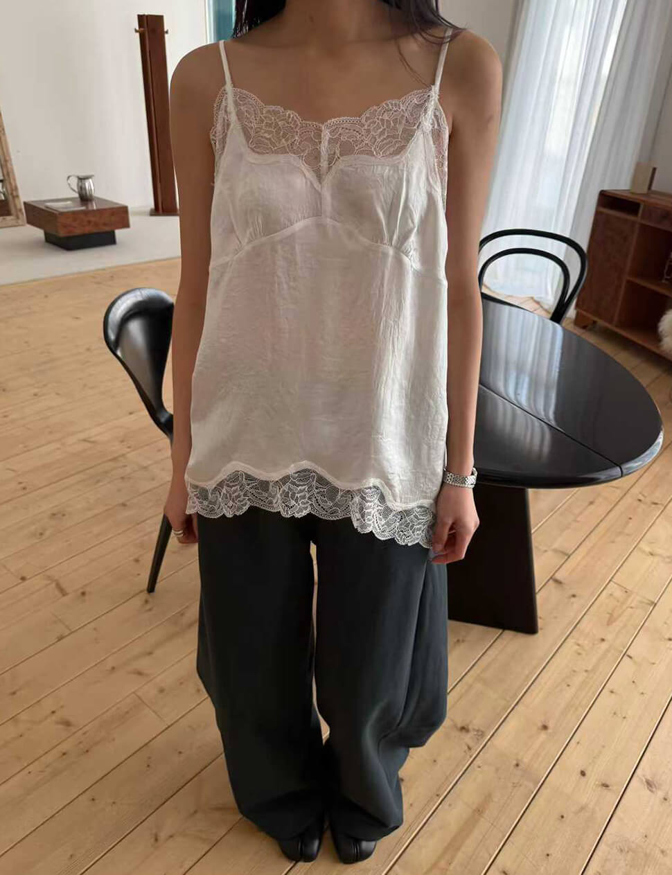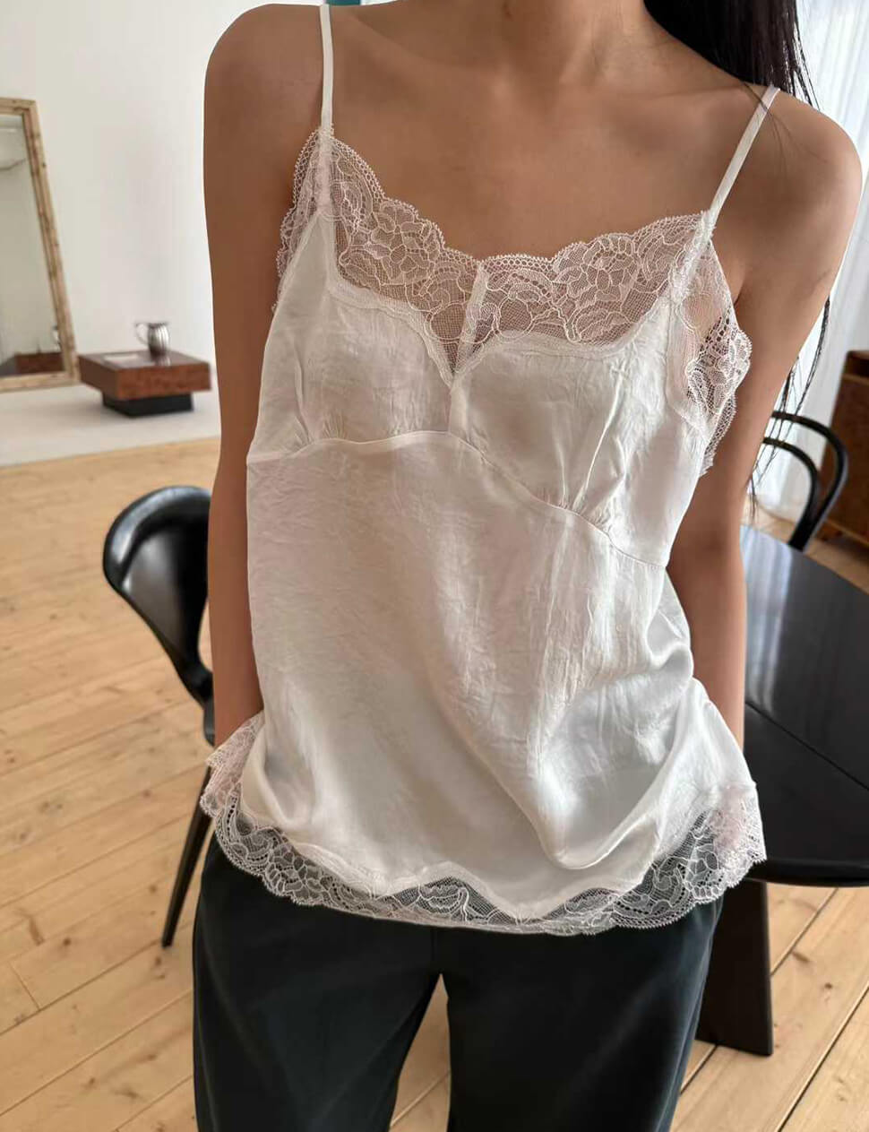 We produce on demand-once it's gone, it's gone.The camisole that blurs the line between lingerie and outerwear — intentionally. Cut from a lightweight silky fabric with a soft sheen, this white cami is finished with delicate floral scalloped lace at the neckline and hem. Thin adjustable straps, a gently fitted bust, and a relaxed flow through the body. Wear it tucked into wide-leg trousers for an effortless Parisian look, layered under a blazer, or alone on warmer evenings.