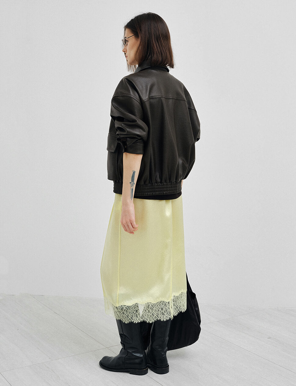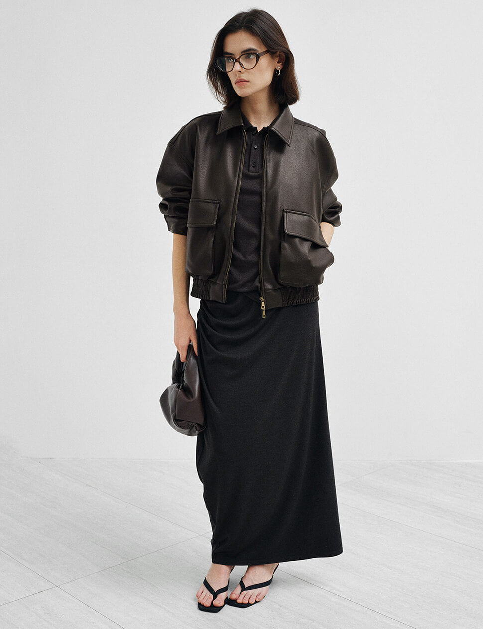 The dark brown leather bomber, done right. This oversized faux leather cropped bomber jacket leads with the details that matter — two oversized cargo pockets at the chest, antique gold zip hardware, a spread collar, and a ribbed elastic hem that keeps the volume intentional. Cut with a relaxed, slightly boxy silhouette and finished with a full-length zip front, it works over everything from a slip skirt and tank to wide-leg trousers and a tee.