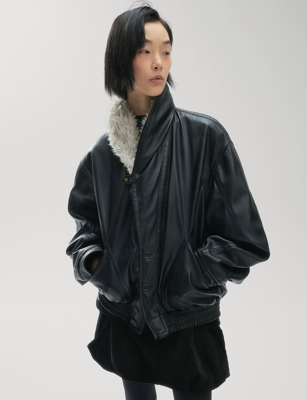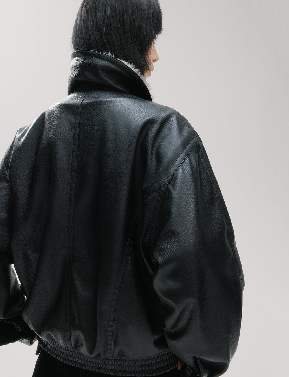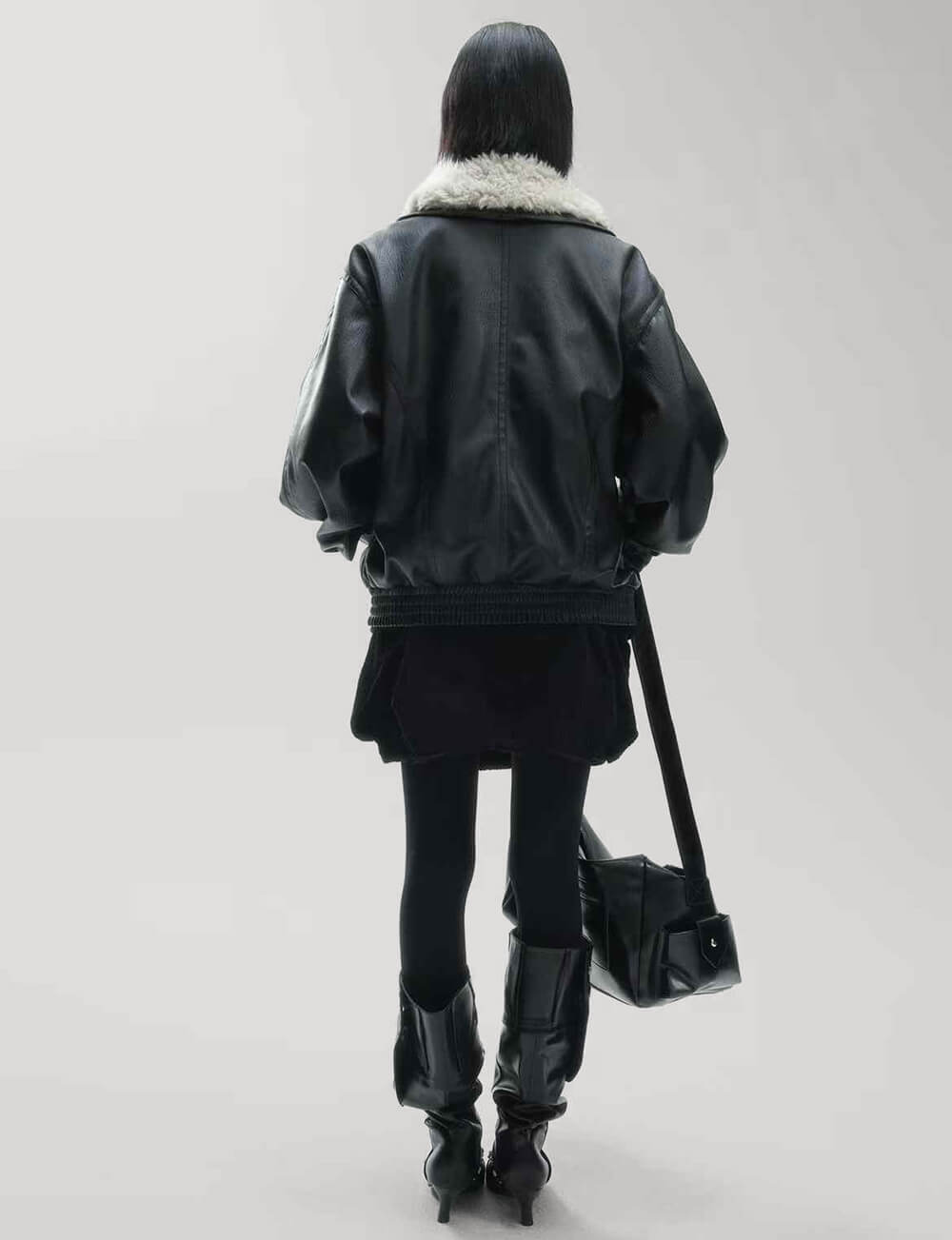 Black leather vintage-style leather with faux fur collar .
