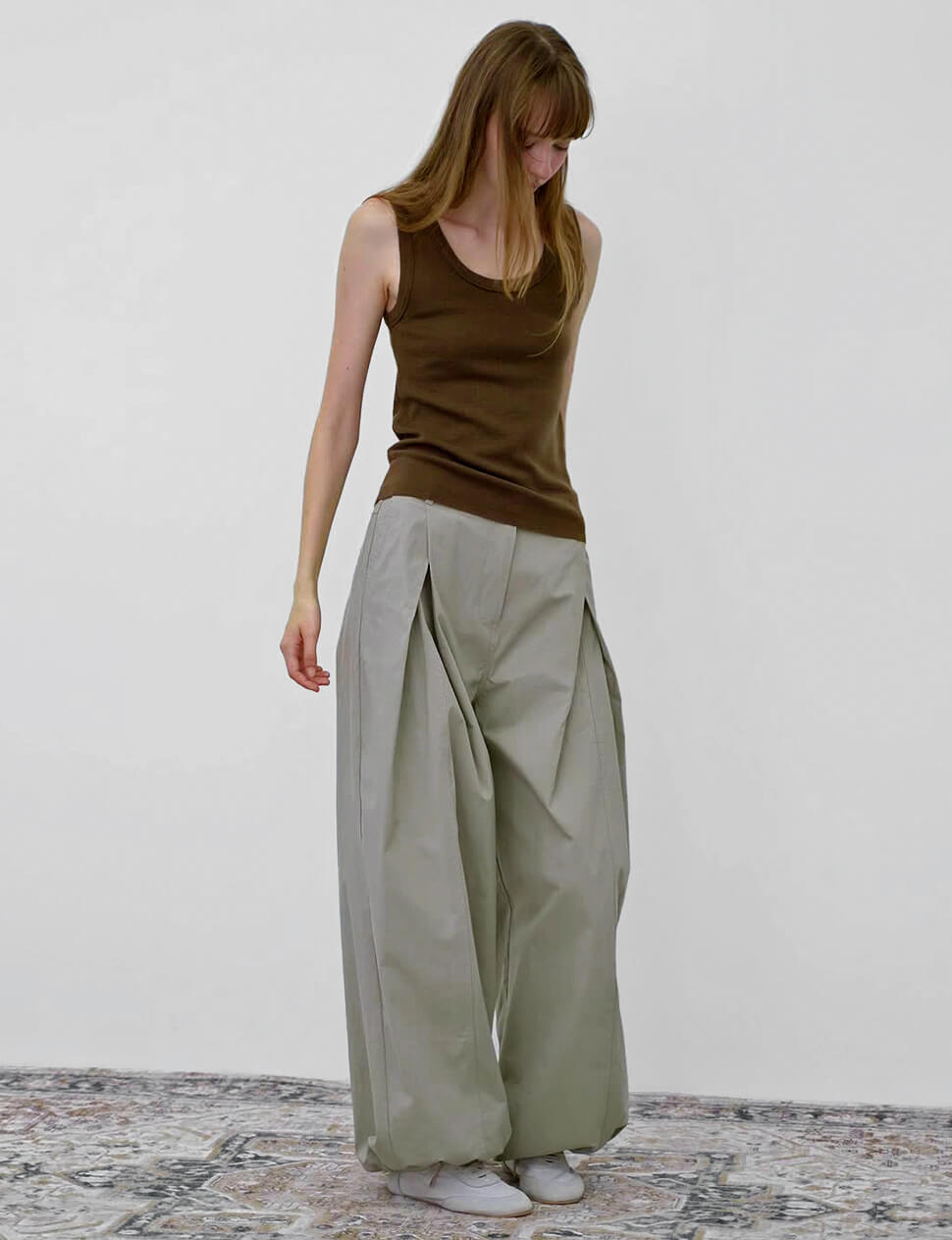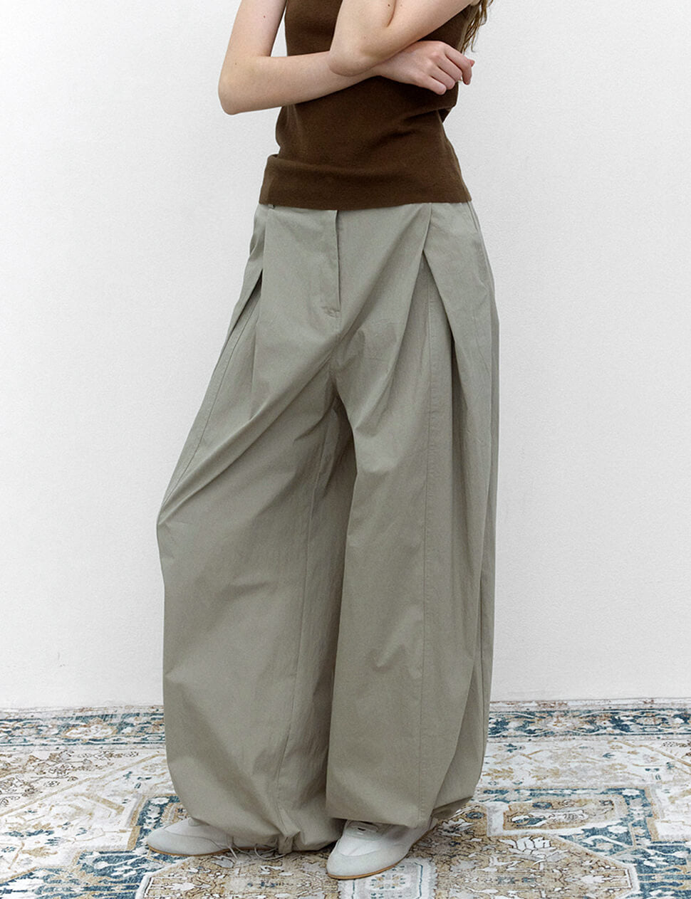 Grey pleated baggy pants with parachute gathered hem