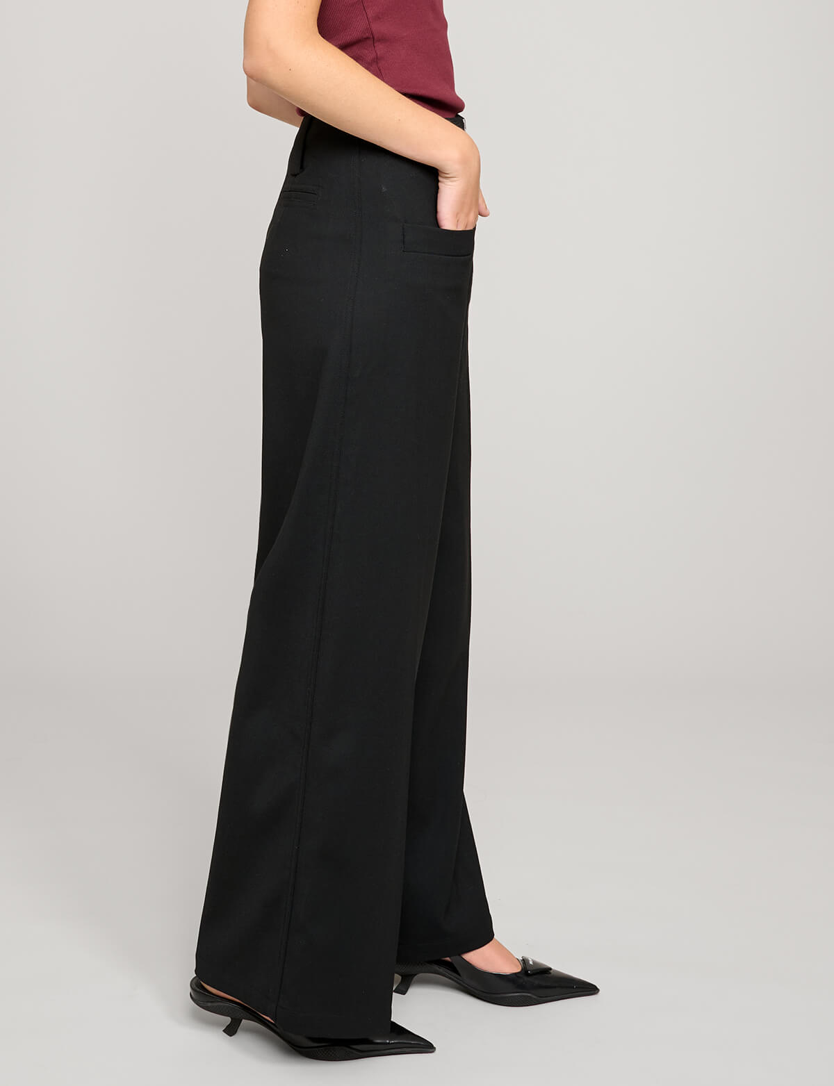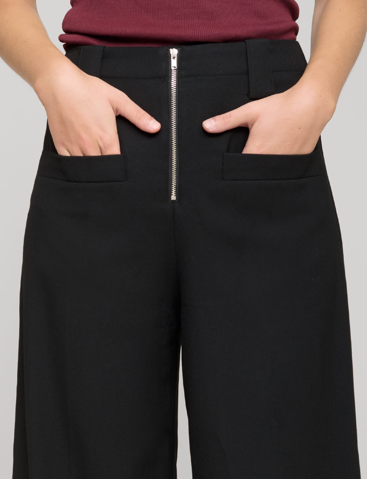 Chic black wig-leg pants with zip center and front pockets.