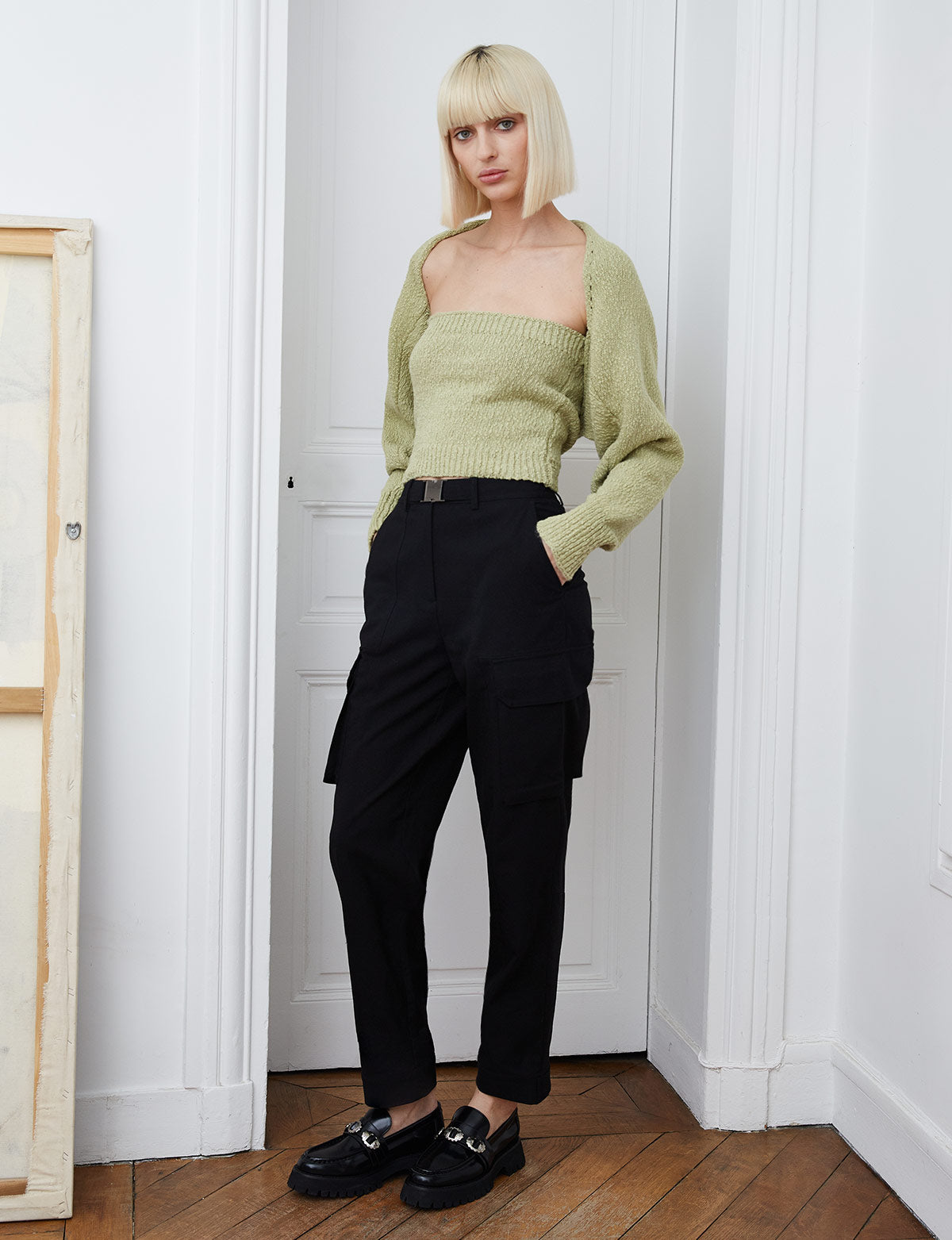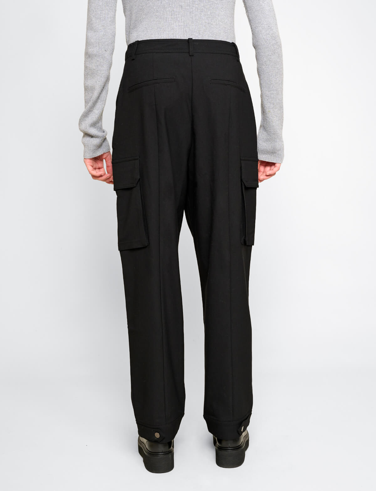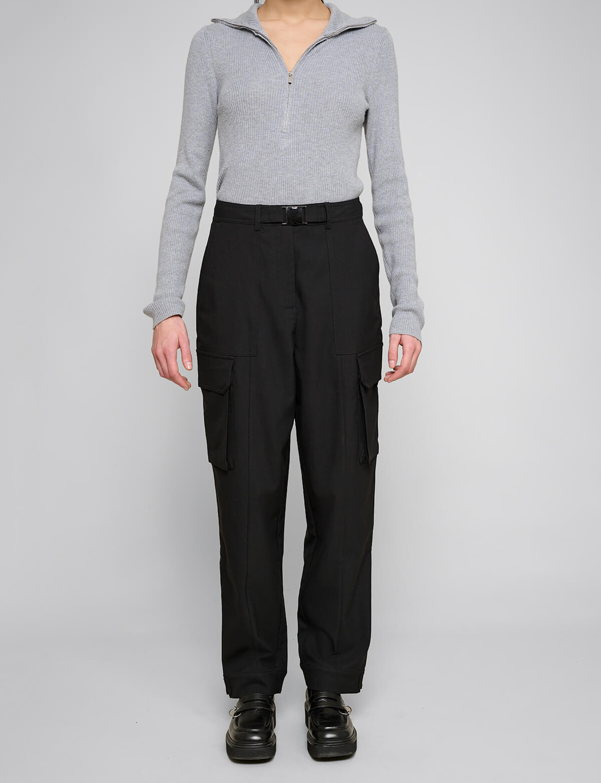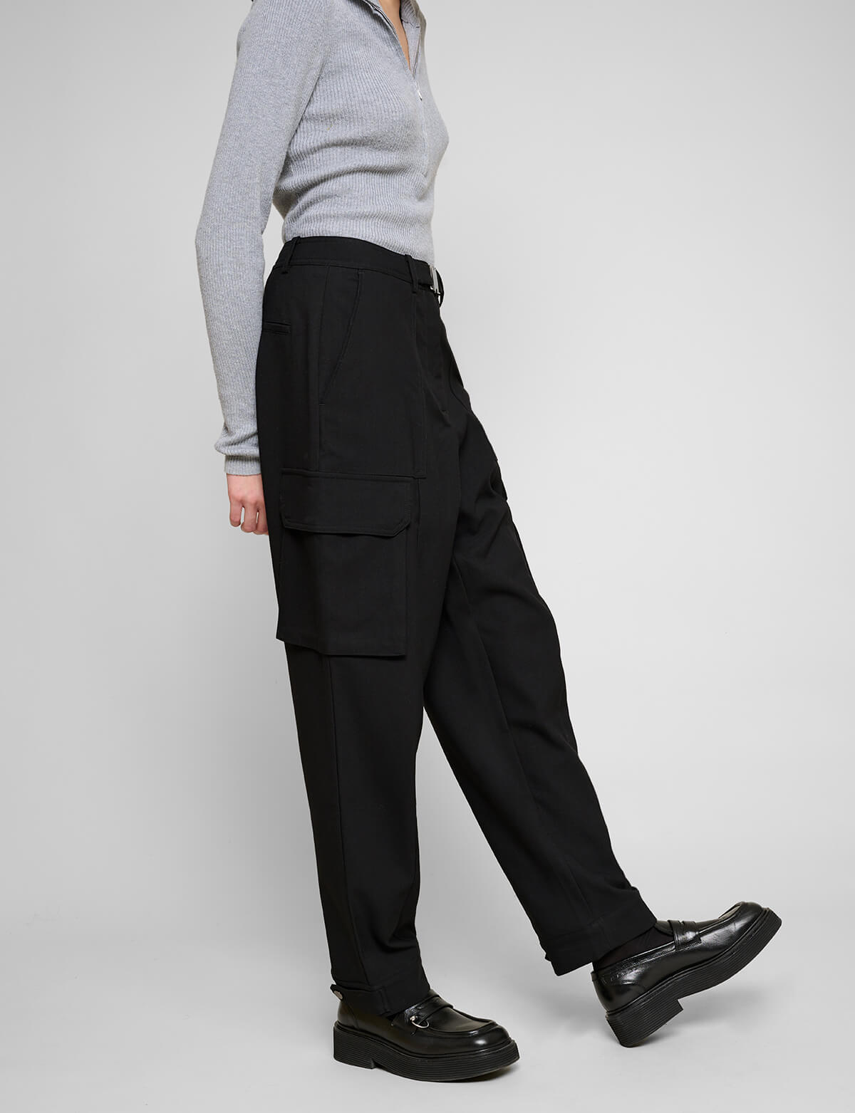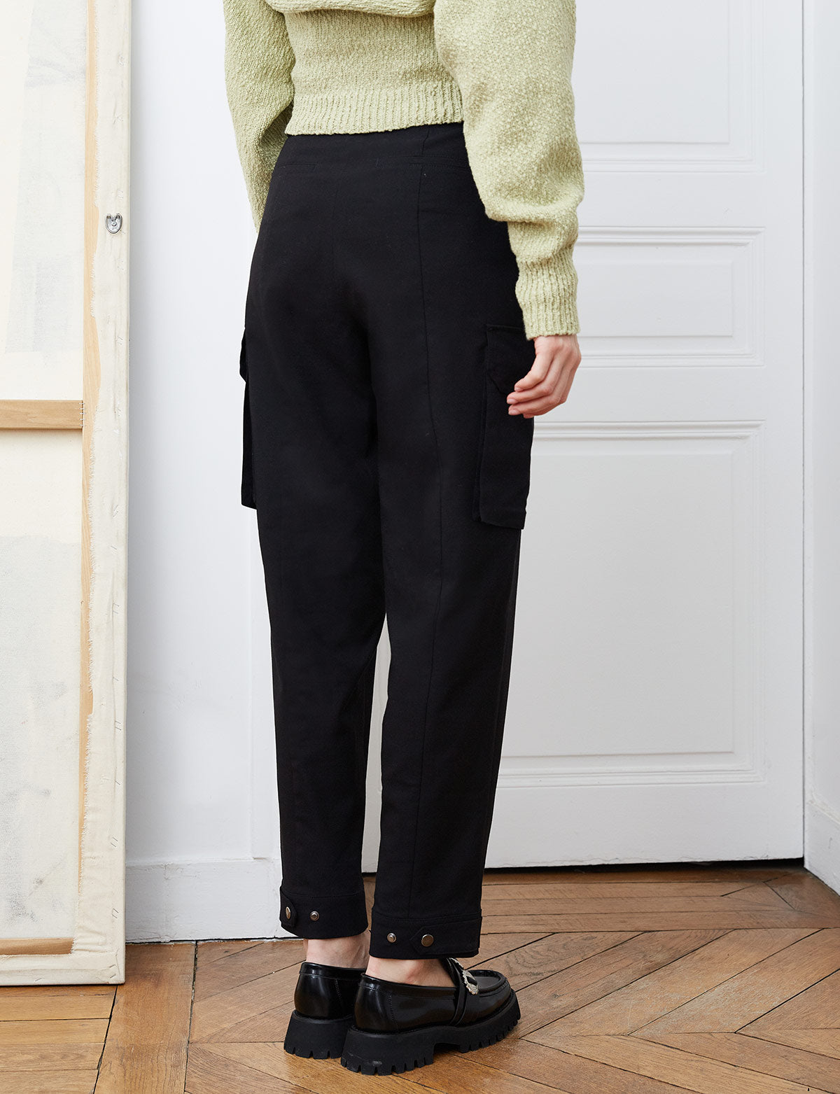 Chic black cargo pants with metal belt clip and multi utility pockets .