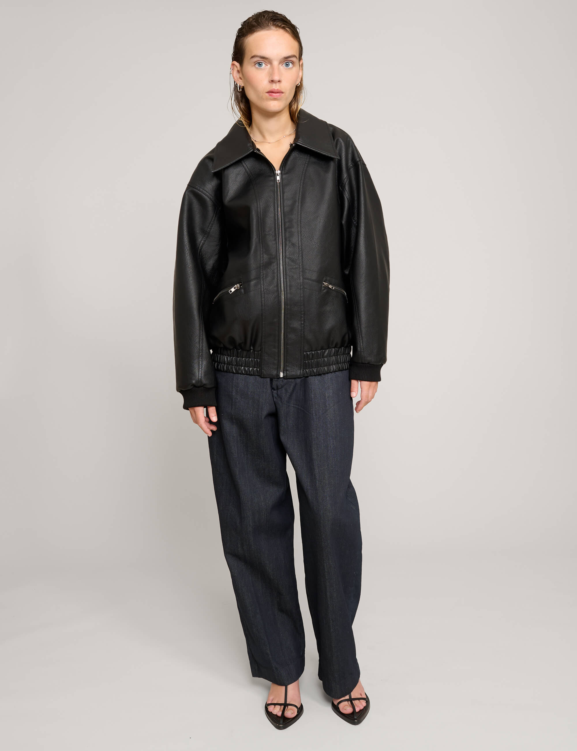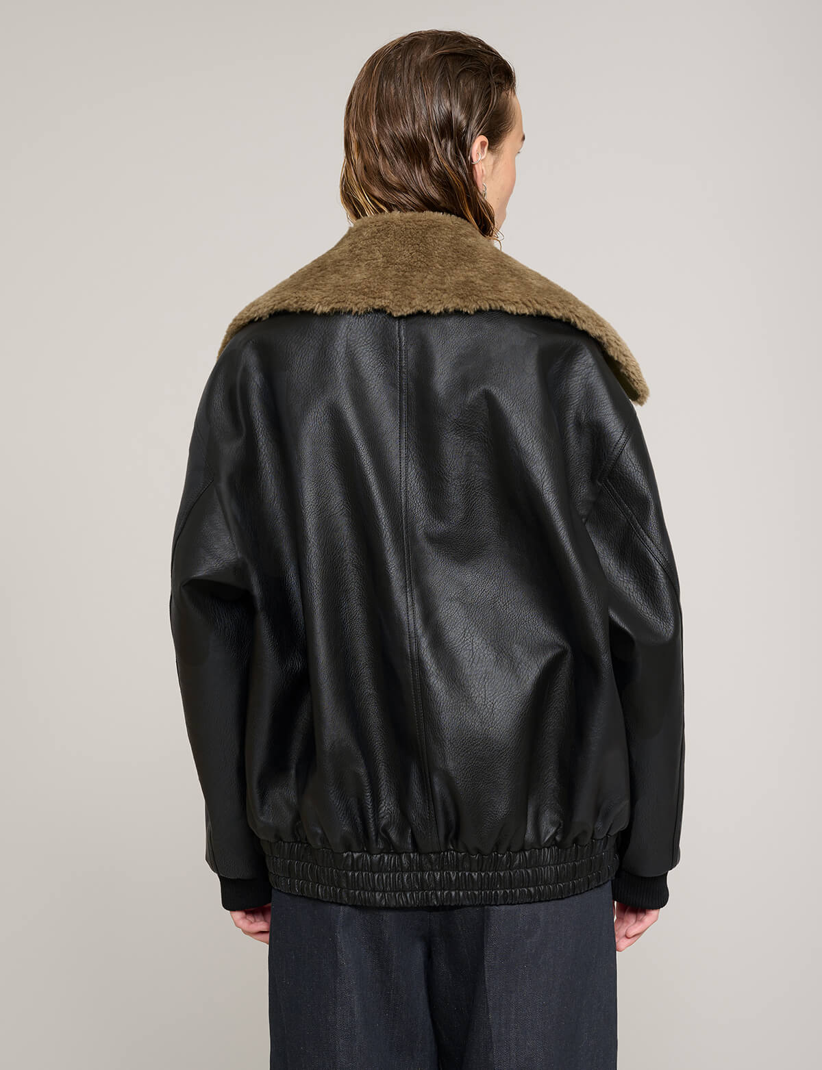 Removable fur collar leather bomber jacket .