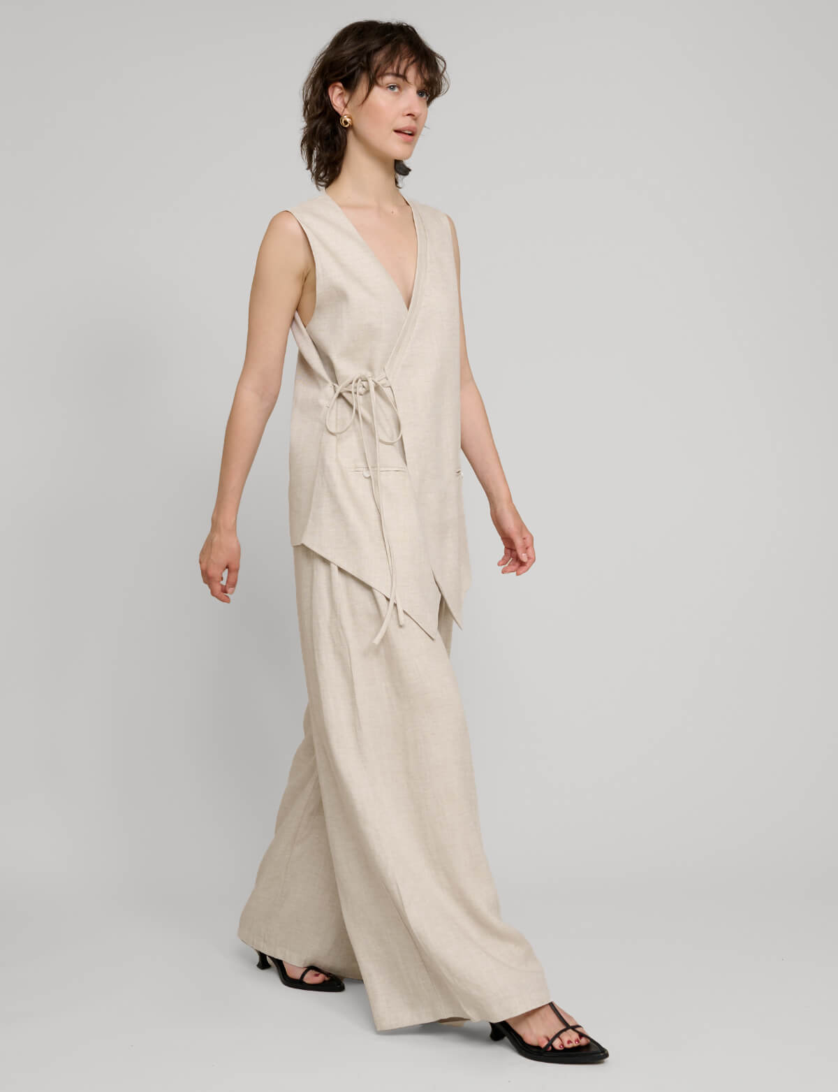 Chic oversized tie wrap vest . Styled with matching wide leg pants .