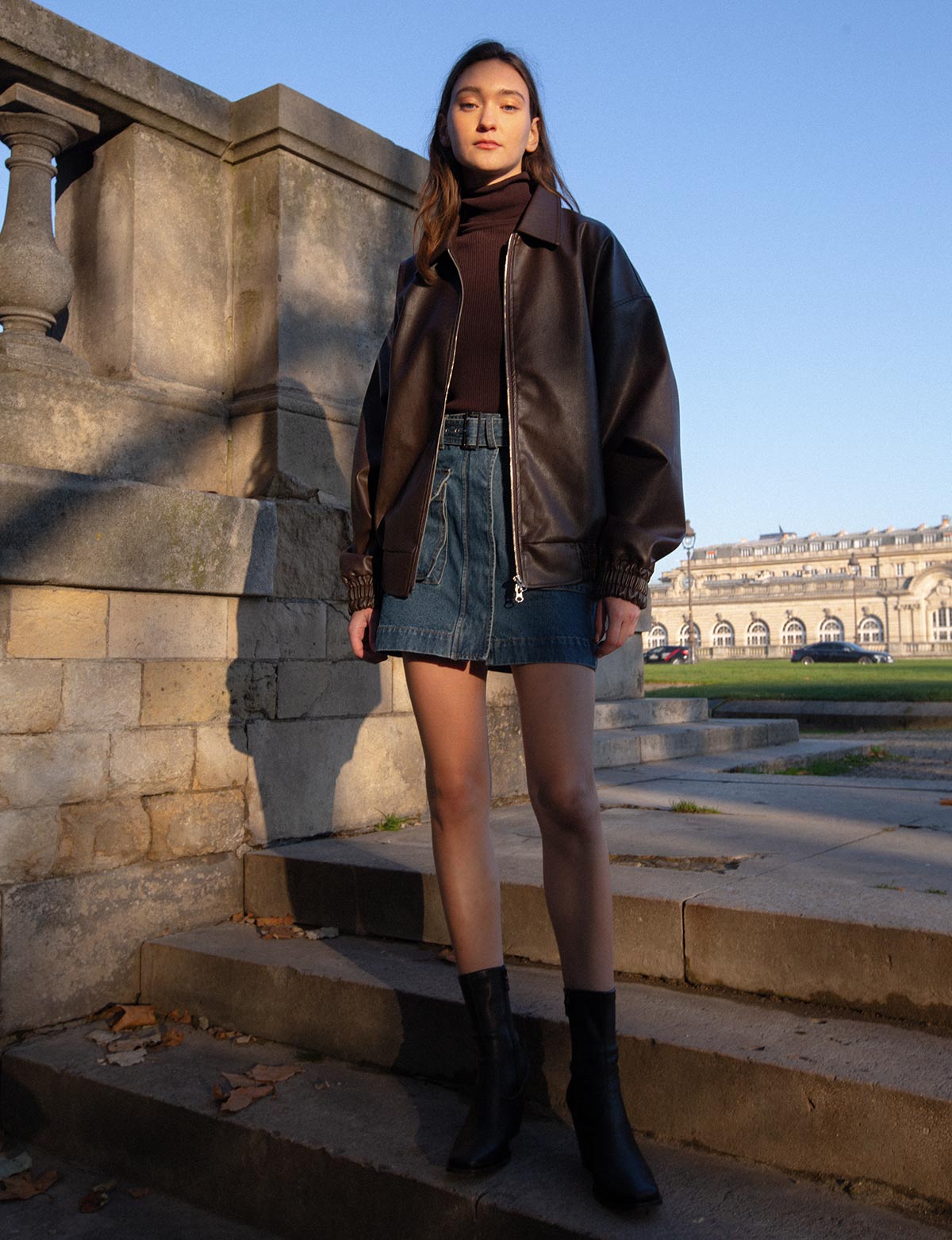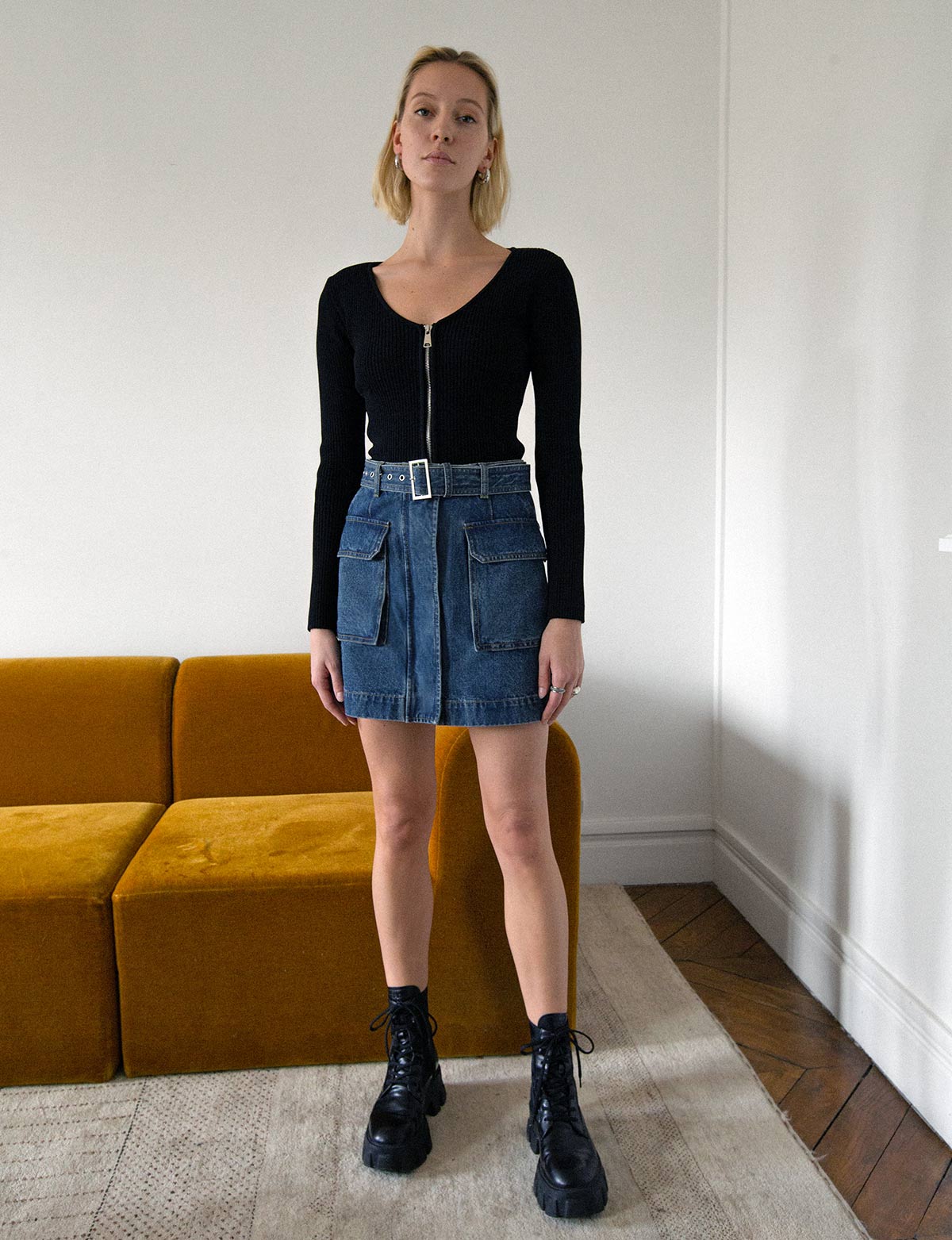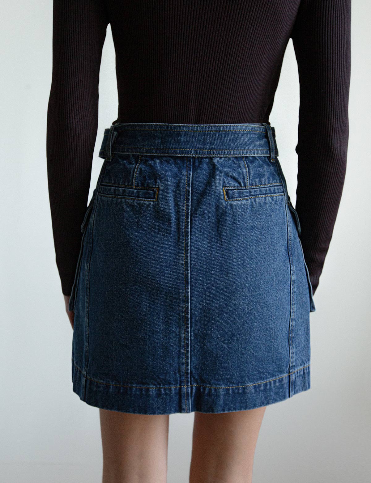 Denim mini skirt with cargo patch pockets and optional denim belt.
