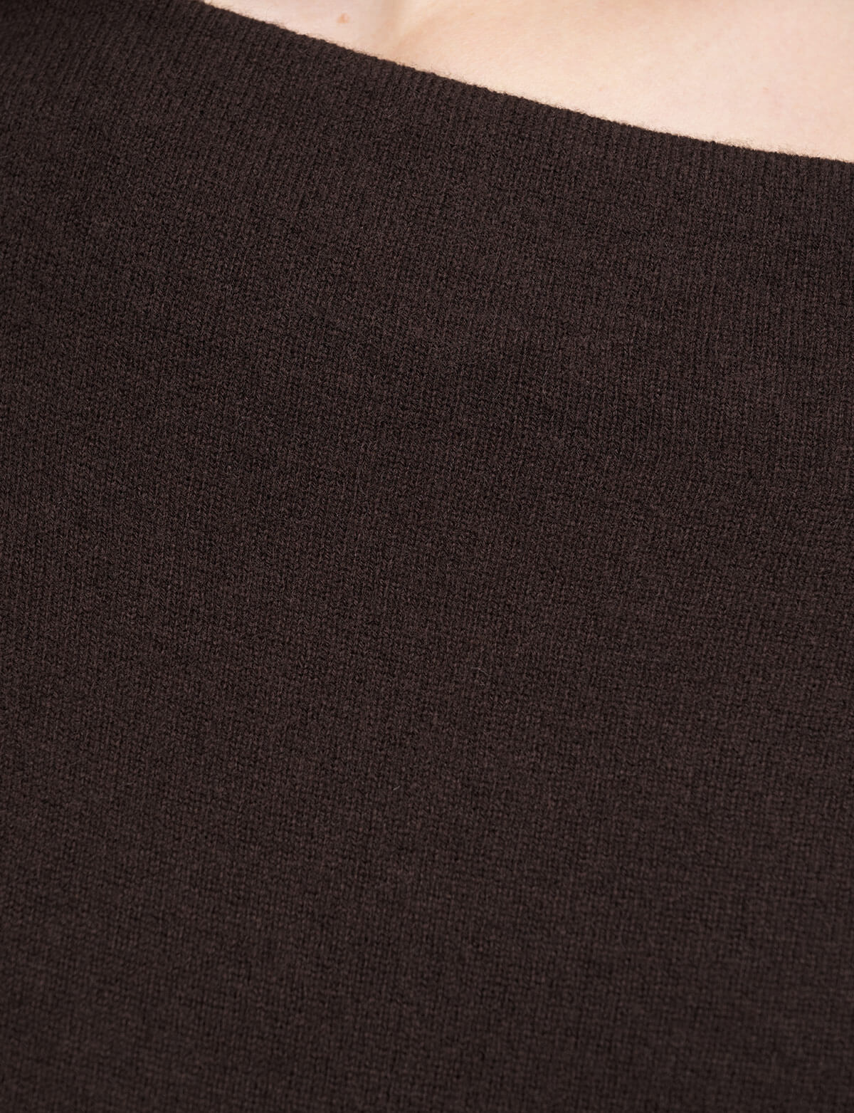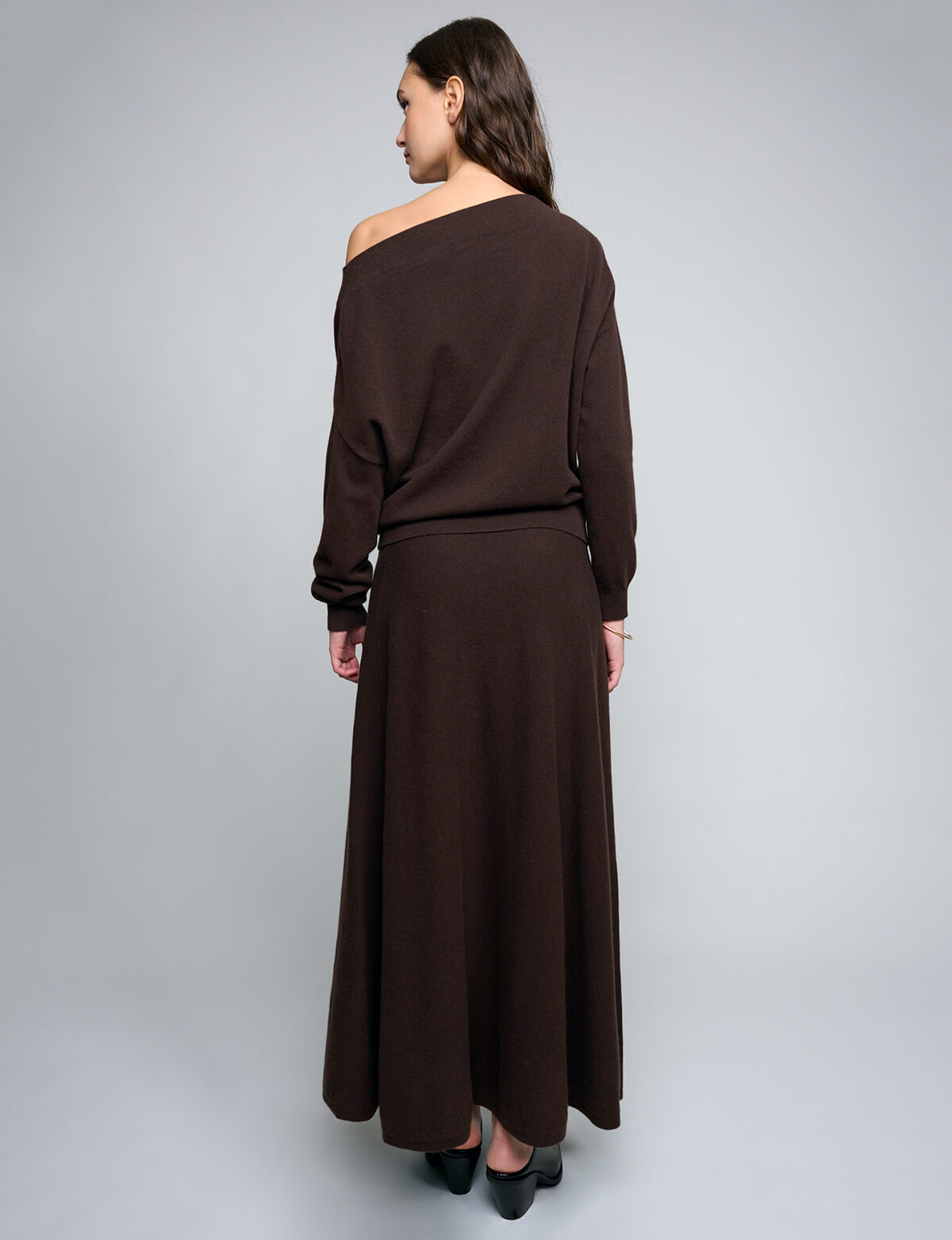 Chocolate brown maxi full skirt with elastic waistband . Styled with matching off-the-shoulder knit top.